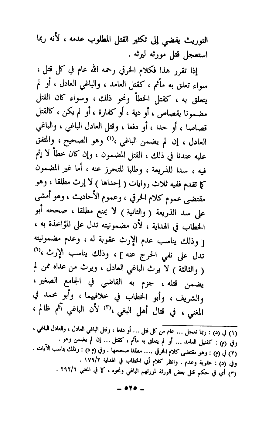 إذا تقرر هذا، فكلام الخرقي - رَحِمَهُ اللَّهُ - عام في كل قتل، سواء تعلق به مأثم، كقتل العامد، والباغي العادل، أو لم يتعلق به، كقتل الخطأ ونحو ذلك، وسواء كان القتل مضمونا بقصاص، أو دية، أو كفارة، أو لم يكن، كالقتل قصاصا، أو حدا، أو دفعا، وقتل العادل الباغي، والباغي العادل، إن لم يضمن الباغي، وهو الصحيح، والمتفق عليه عندنا في ذلك، القتل المضمون، وإن كان خطأ لا إثم فيه، سدا للذريعة، وطلبا للتحرز عنه، أما غير المضمون كما تقدم ففيه ثلاث روايات: