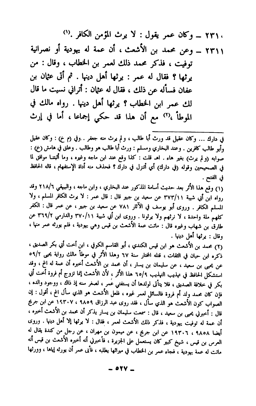 2311 - وعن محمد بن الأشعث، أن عمة له يهودية أو نصرانية توفيت، فذكر محمد ذلك لعمر بن الخطاب، وقال: من يرثها؟ فقال له عمر: يرثها أهل دينها. ثم أتى عثمان بن عفان فسأله عن ذلك، فقال له عثمان: أتراني نسيت ما قال لك عمر بن الخطاب؟ يرثها أهل دينها. رواه مالك في الموطأ، مع أن هذا قد حكي إجماعا، أما في إرث