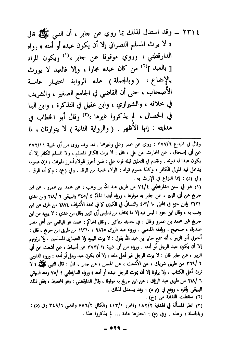 2314 - وقد استدل لذلك بما روي عن جابر، أن النبي - صَلَّى اللَّهُ عَلَيْهِ وَسَلَّمَ - قال: «لا يرث المسلم النصراني إلا أن يكون عبده أو أمته» رواه الدارقطني، وروي موقوفا عن جابر، ويكون المراد [بالعبد] من كان عبده مجازا، وإلا فالعبد لا يورث بالإجماع.