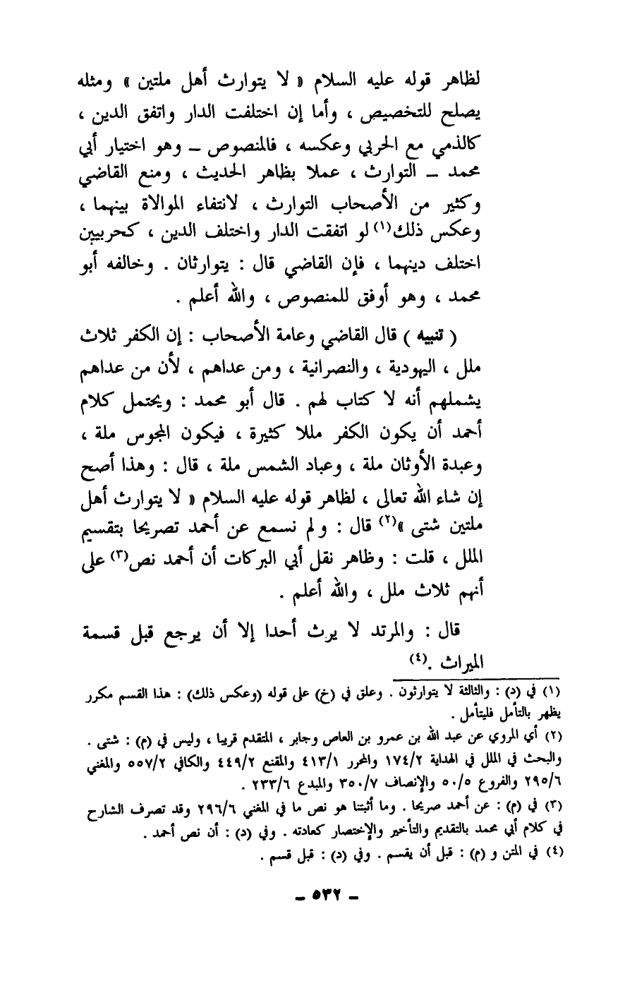 قال أبو محمد: ويحتمل كلام أحمد أن يكون الكفر مللا كثيرة، فيكون المجوس ملة، وعبدة الأوثان ملة، وعباد الشمس ملة، قال: وهذا أصح إن شاء الله تعالى؛ لظاهر قوله - عَلَيْهِ السَّلَامُ -: «لا يتوارث أهل ملتين شتى» قال: ولم نسمع عن أحمد تصريحا بتقسيم الملل، قلت: وظاهر نقل أبي البركات أن أحمد نص على أنهم ثلاث ملل، والله أعلم.