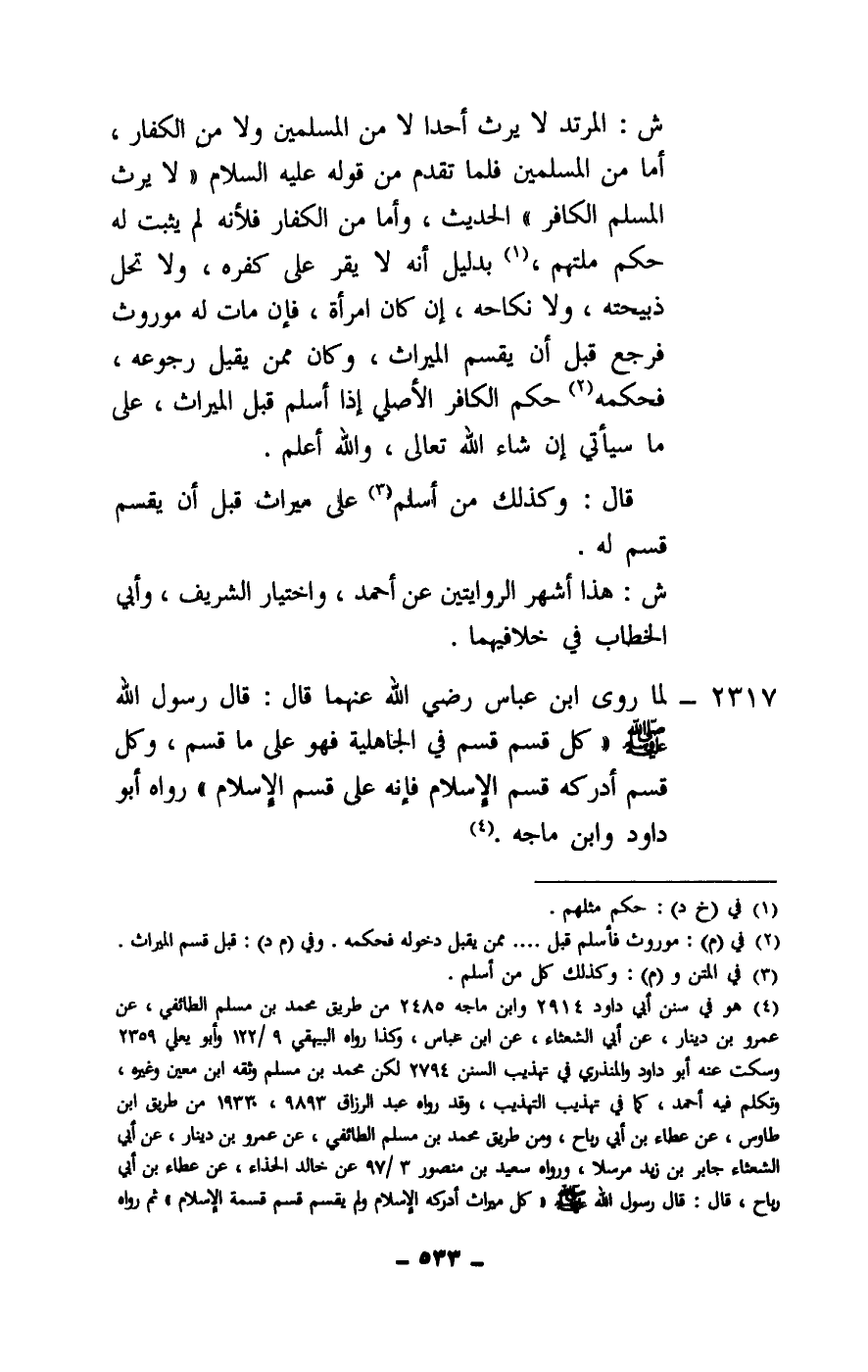 2317 - لما روى ابن عباس - رَضِيَ اللَّهُ عَنْهُمَا - قال: قال رسول الله - صَلَّى اللَّهُ عَلَيْهِ وَسَلَّمَ -: «كل قسم قسم في الجاهلية فهو على ما قسم، وكل قسم أدركه قسم الإسلام فإنه على قسم الإسلام» رواه أبو داود وابن ماجه.