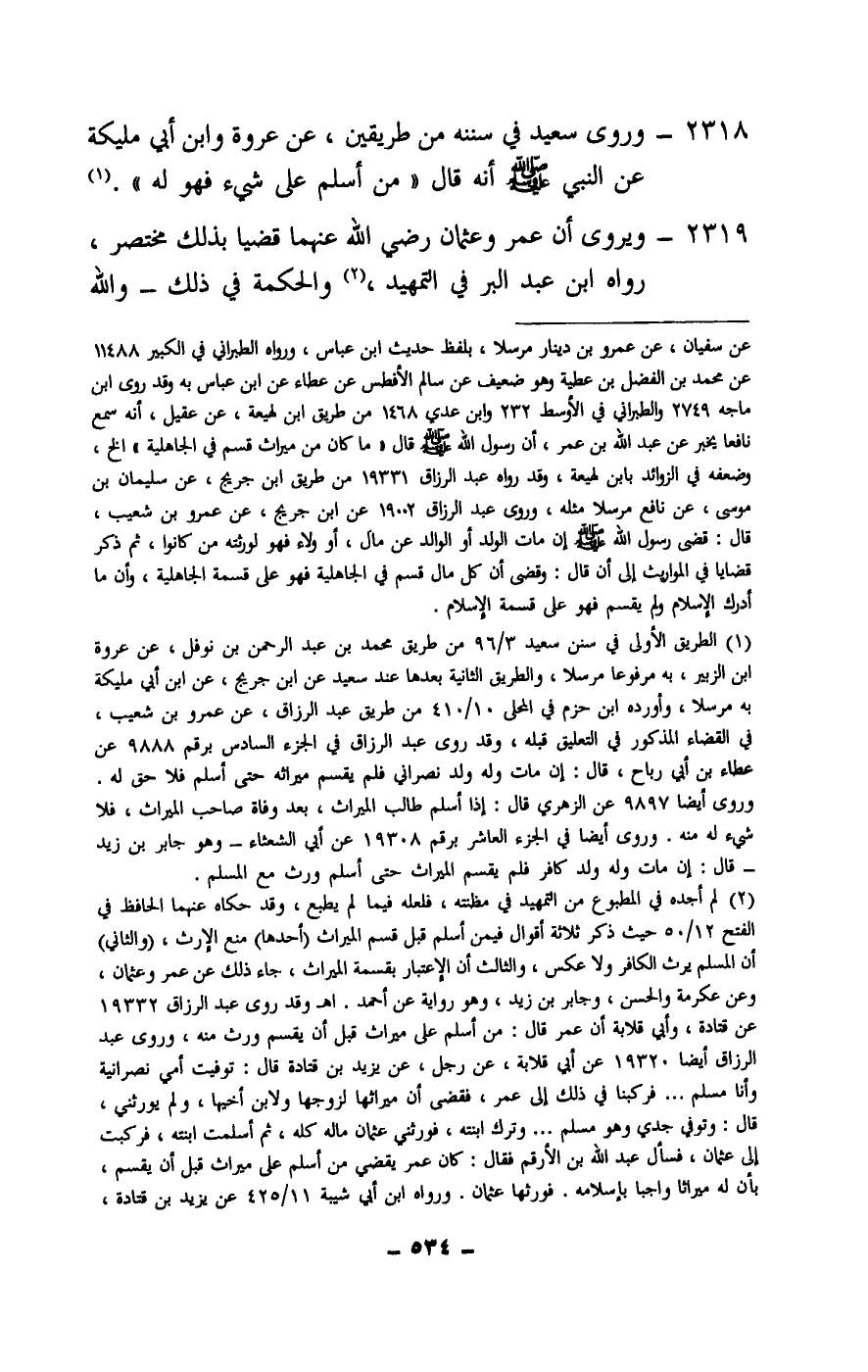 2318 - وروى سعيد في سننه من طريقين، عن عروة وابن أبي مليكة عن النبي - صَلَّى اللَّهُ عَلَيْهِ وَسَلَّمَ - أنه قال: «من أسلم على شيء فهو له» » .