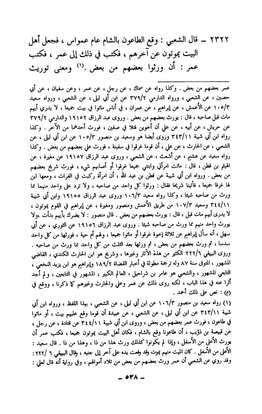 2322 - قال الشعبي: وقع الطاعون بالشام عام عمواس، فجعل أهل البيت يموتون عن آخرهم، فكتب في ذلك إلى عمر، فكتب عمر: أن ورثوا بعضهم من بعض.