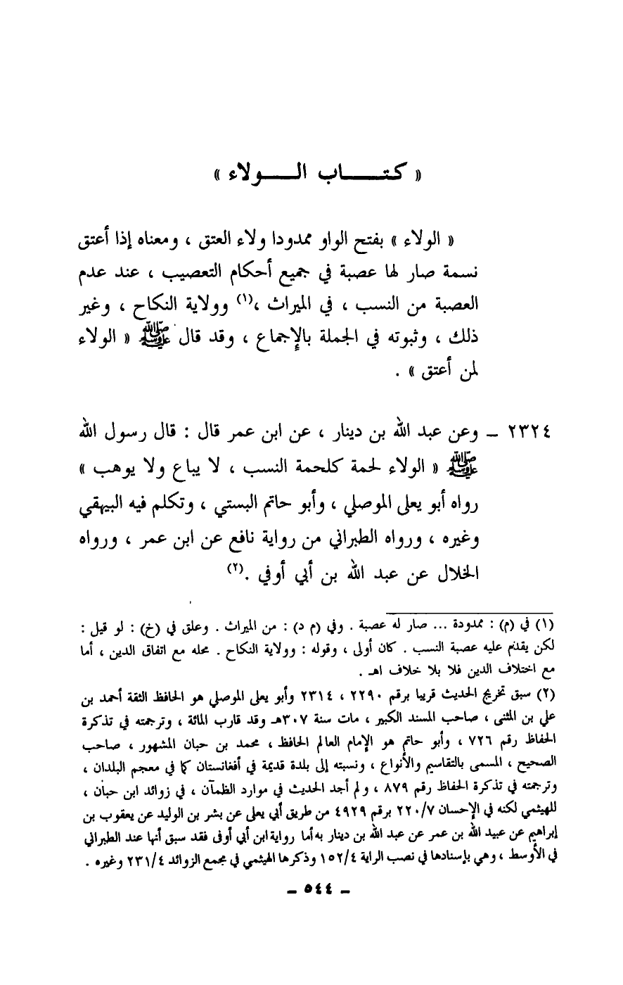 2324 - وعن عبد الله بن دينار، عن ابن عمر قال: قال رسول الله - صَلَّى اللَّهُ عَلَيْهِ وَسَلَّمَ -: «الولاء لحمة كلحمة النسب، لا يباع ولا يوهب» . رواه أبو يعلى الموصلي، وأبو حاتم البستي، وتكلم فيه البيهقي وغيره، ورواه الطبراني من رواية نافع عن ابن عمر، ورواه الخلال عن عبد الله بن أبي أوفى.