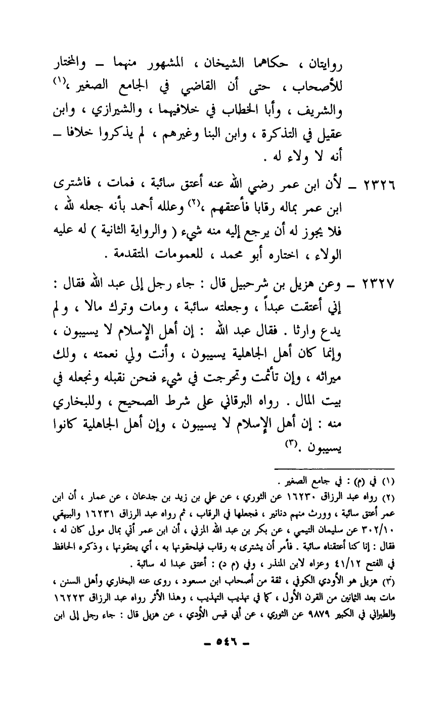 2327 - وعن هزيل بن شرحبيل قال: جاء رجل إلى عبد الله فقال: إني أعتقت عبدا، وجعلته سائبة، ومات وترك مالا، ولم يدع وارثا. فقال عبد الله: إن أهل الإسلام لا يسيبون، وإنما كان أهل الجاهلية يسيبون، وأنت ولي نعمته، ولك ميراثه، وإن تأثمت وتحرجت في شيء فنحن نقبله ونجعله في بيت المال. رواه البرقاني على شرط الصحيح، وللبخاري منه: إن أهل الإسلام لا يسيبون، وإن أهل الجاهلية كانوا يسيبون.
