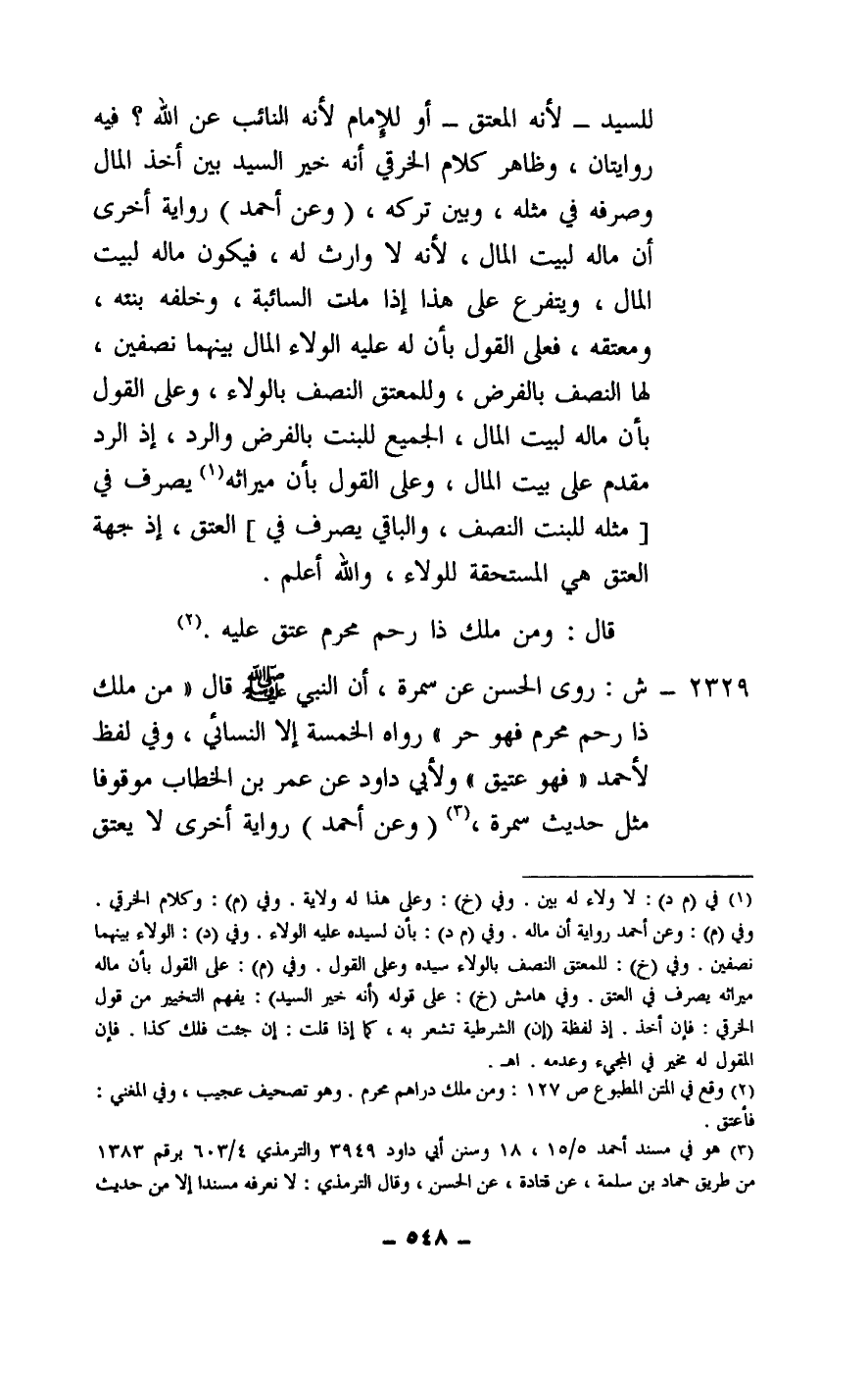2329 - ش: روى الحسن عن سمرة، أن النبي - صَلَّى اللَّهُ عَلَيْهِ وَسَلَّمَ - قال: «من ملك ذا رحم محرم فهو حر» رواه الخمسة إلا النسائي، وفي لفظ لأحمد: فهو عتيق ولأبي داود عن عمر بن الخطاب موقوفا مثل حديث سمرة.