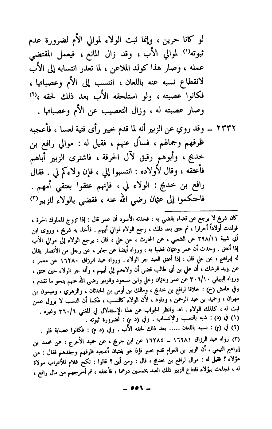 2332 - وقد روي عن الزبير، أنه لما قدم خيبر رأى فتية لعسا، فأعجبه ظرفهم وجمالهم، فسأل عنهم، فقيل له: موالي رافع بن خديج، وأبوهم رقيق لآل الحرقة، فاشترى الزبير أباهم فأعتقه، وقال لأولاده: انتسبوا إلي، فإن ولاءكم لي. فقال رافع بن خديج: الولاء لي، فإنهم عتقوا بعتقي أمهم. فاحتكموا إلى عثمان - رَضِيَ اللَّهُ عَنْهُ -، فقضى بالولاء للزبير