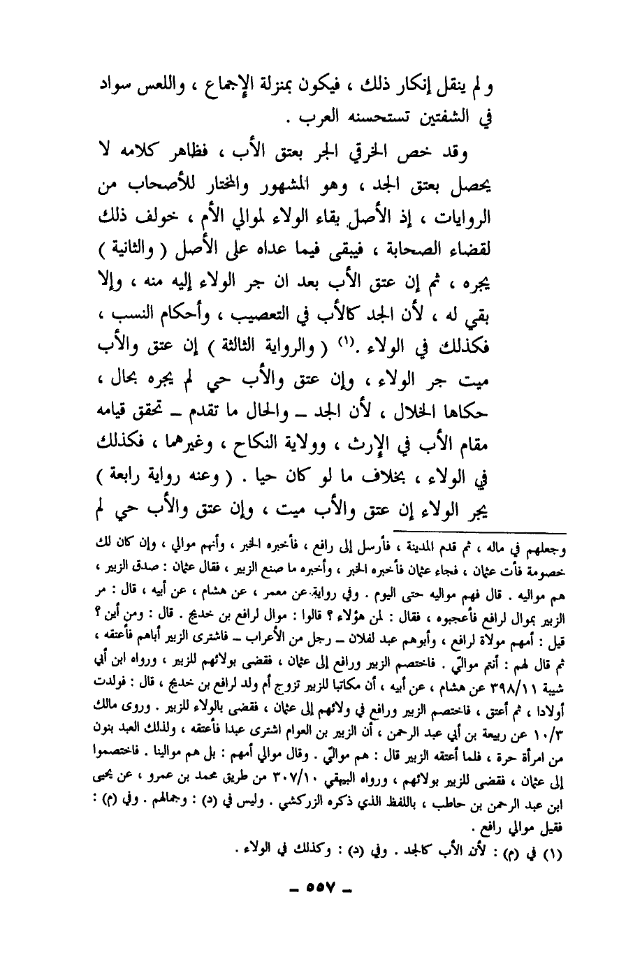 وقد خص الخرقي الجر بعتق الأب، فظاهر كلامه: لا يحصل بعتق الجد، وهو المشهور والمختار للأصحاب من الروايات، إذ الأصل بقاء الولاء لموالي الأم، خولف ذلك لقضاء الصحابة، فيبقى فيما عداه على الأصل.