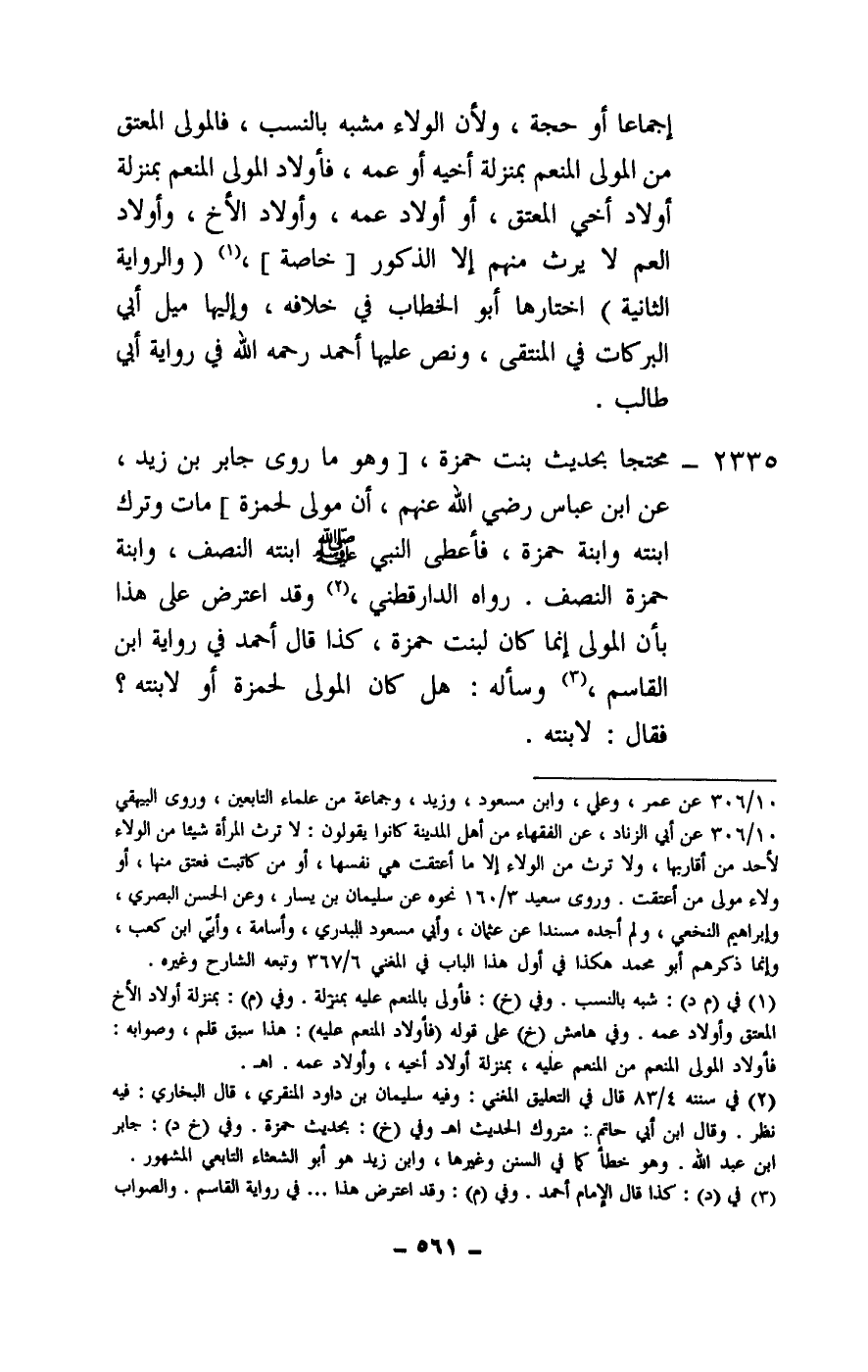 2335 - محتجا بحديث بنت حمزة، [وهو ما روى جابر بن زيد، عن ابن عباس - رَضِيَ اللَّهُ عَنْهُمْ -، «أن مولى لحمزة] مات وترك ابنته وابنة حمزة، فأعطى النبي - صَلَّى اللَّهُ عَلَيْهِ وَسَلَّمَ - ابنته النصف، وابنة حمزة النصف» . رواه الدارقطني، وقد اعترض على هذا؛ بأن المولى إنما كان لبنت حمزة، كذا قال أحمد في رواية ابن القاسم، وسأله: هل كان المولى لحمزة أو لابنته؟ فقال: لابنته.