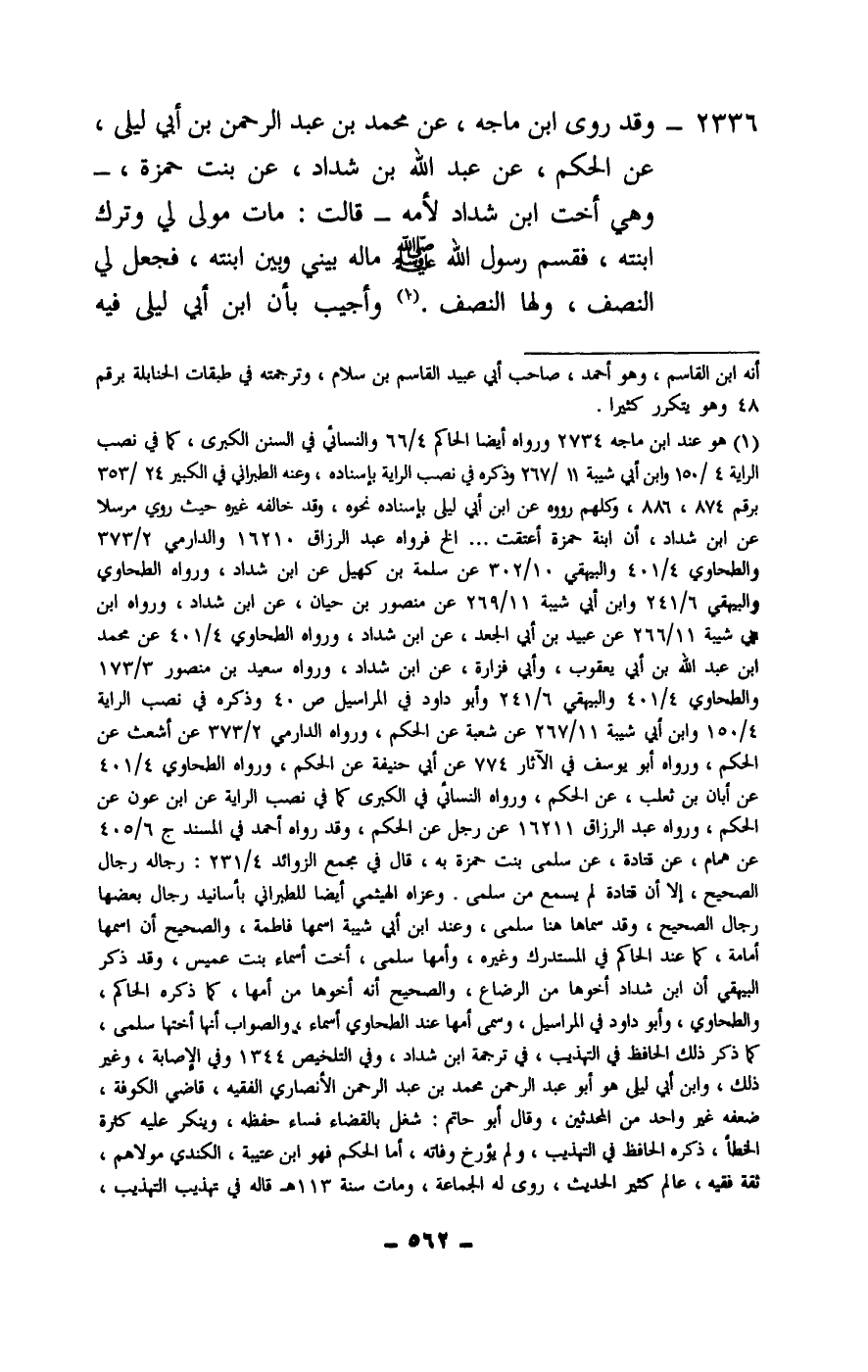 2336 - وقد روى ابن ماجه، عن محمد بن عبد الرحمن بن أبي ليلى، عن الحكم، عن عبد الله بن شداد، عن بنت حمزة - وهي أخت ابن شداد لأمه - «قالت: مات مولى لي وترك ابنته، فقسم رسول الله - صَلَّى اللَّهُ عَلَيْهِ وَسَلَّمَ - ماله بيني وبين ابنته، فجعل لي النصف، ولها النصف» ، وأجيب بأن ابن أبي ليلى فيه