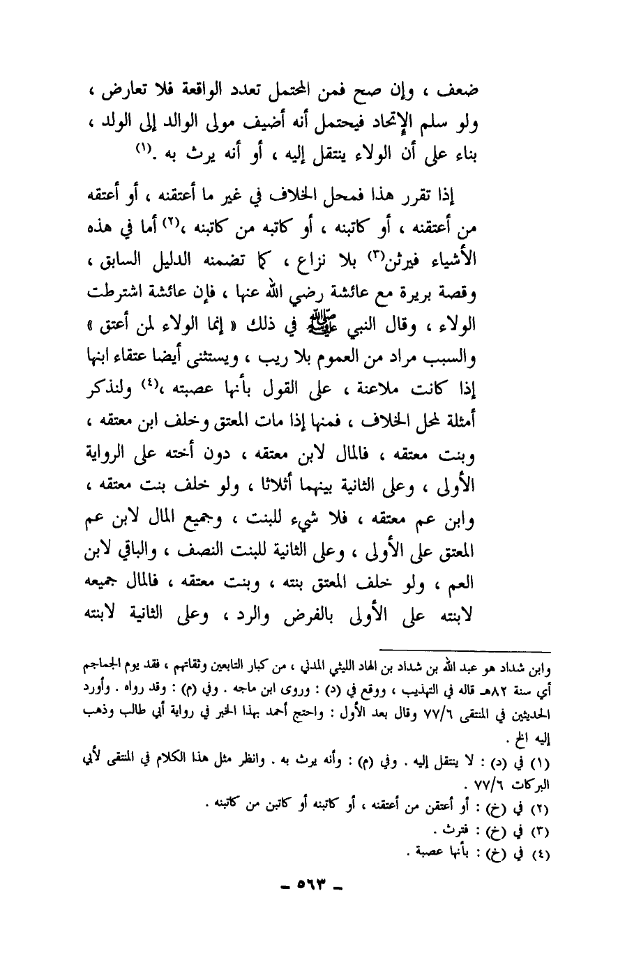 إذا تقرر هذا، فمحل الخلاف في غير ما أعتقنه، أو أعتقه من أعتقنه، أو كاتبنه، أو كاتبه من كاتبنه، أما في هذه الأشياء فيرثن بلا نزاع، كما تضمنه الدليل السابق، وقصة بريرة مع عائشة - رَضِيَ اللَّهُ عَنْهَا -، «فإن عائشة اشترطت الولاء، وقال النبي - صَلَّى اللَّهُ عَلَيْهِ وَسَلَّمَ - في ذلك: «إنما الولاء لمن أعتق» ، والسبب مراد من العموم بلا ريب، ويستثنى أيضا عتقاء ابنها إذا كانت ملاعنة، على القول بأنها عصبته، ولنذكر أمثلة لمحل الخلاف؛ فمنها: إذا مات المعتق، وخلف ابن معتقه، وبنت معتقه؛ فالمال لابن معتقه، دون أخته على الرواية الأولى. وعلى الثانية: بينهما أثلاثا. ولو خلف بنت معتقه، وابن عم معتقه، فلا شيء للبنت، وجميع المال لابن عم المعتق على الأولى. وعلى الثانية: للبنت النصف، والباقي لابن العم. ولو خلف المعتق بنته، وبنت معتقه، فالمال جميعه لابنته على الأولى بالفرض والرد، وعلى الثانية لابنته