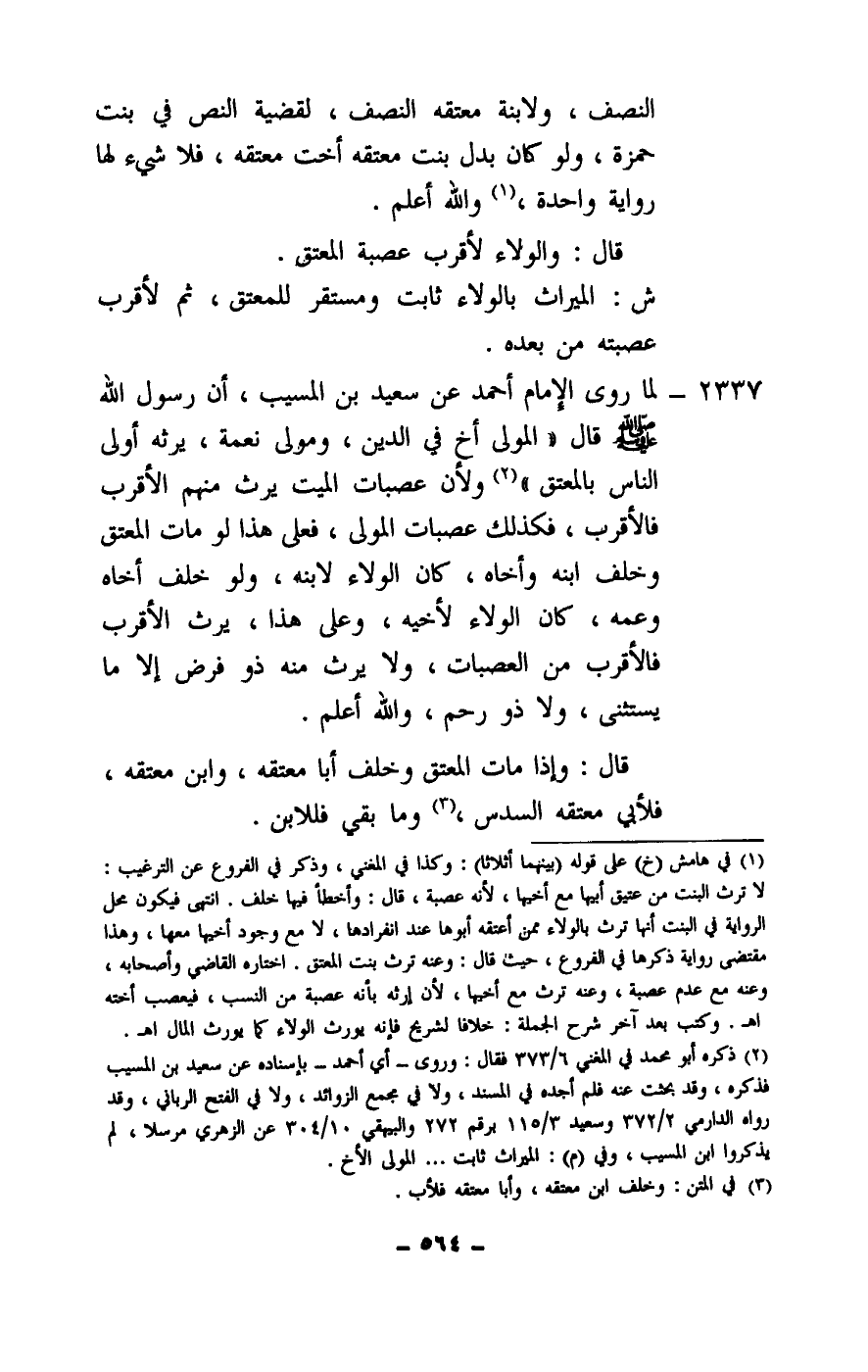 2337 - لما روى الإمام أحمد عن سعيد بن المسيب، أن رسول الله - صَلَّى اللَّهُ عَلَيْهِ وَسَلَّمَ - قال: «المولى أخ في الدين، ومولى نعمة، يرثه أولى الناس بالمعتق» ؛ ولأن عصبات الميت يرث منهم الأقرب فالأقرب، فكذلك عصبات المولى، فعلى هذا لو مات المعتق وخلف ابنه وأخاه، كان الولاء لابنه، ولو خلف أخاه وعمه، كان الولاء لأخيه، وعلى هذا، يرث الأقرب فالأقرب من العصبات، ولا يرث منه ذو فرض إلا ما يستثنى، ولا ذو رحم، والله أعلم.