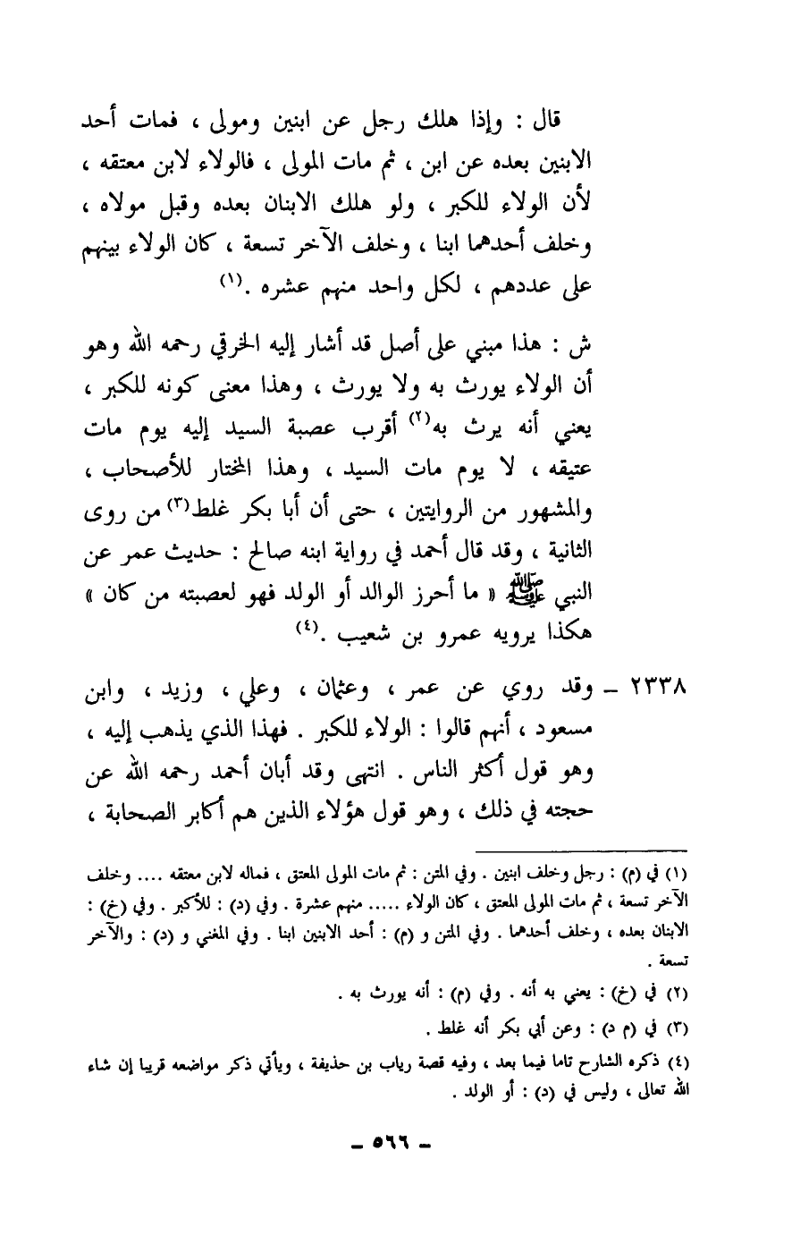 2338 - وقد روي عن عمر، وعثمان، وعلي، وزيد، وابن مسعود، أنهم قالوا: الولاء للكبر. فهذا الذي يذهب إليه، وهو قول أكثر الناس. انتهى. وقد أبان أحمد - رَحِمَهُ اللَّهُ - عنه حجته في ذلك، وهو قول هؤلاء الذين هم أكابر الصحابة،