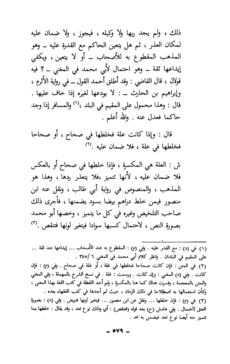 ش: العلة: هي المكسرة، فإذا خلطها في صحاح أو بالعكس فلا ضمان عليه، لأنها تتميز، فلا يتعذر ردها، وهذا هو المذهب، والمنصوص في رواية أبي طالب، ونقل عنه ابن منصور فيمن خلط دراهم بيضا بسود يضمنها، فأجر ذلك صاحب التلخيص وغيره في كل ما يتميز، وخصها أو محمد بصورة النص، لاحتمال كسبها سوادا فيتغير لونها فتنقص.