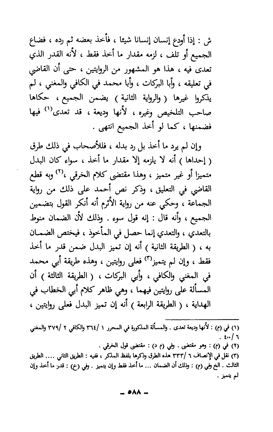ش: إذا أودع إنسان إنسانا شيئا، فأخذ بعضه ثم رده، فضاع الجميع أو تلف، لزمه مقدار ما أخذ فقط، لأنه القدر الذي تعدى فيه، هذا هو المشهور من الروايتين، حتى إن القاضي في تعليقه، وأبا البركات وأبا محمد في الكافي والمغني، لم يذكروا غيرها.