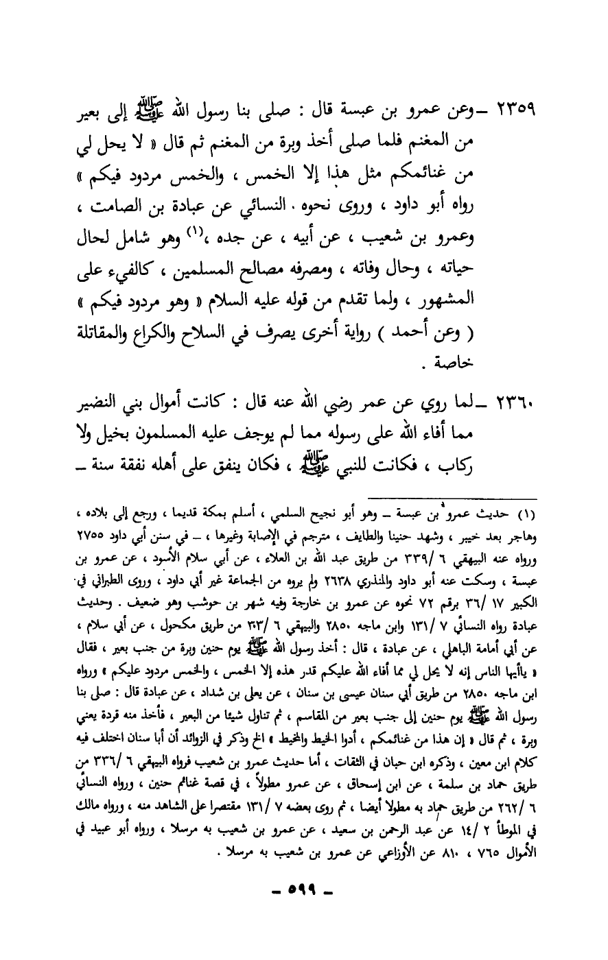 2359 - وعن عمرو بن عبسة قال: «صلى بنا رسول الله - صَلَّى اللَّهُ عَلَيْهِ وَسَلَّمَ - إلى بعير من المغنم، فلما صلى أخذ وبرة من المغنم ثم قال: «لا يحل لي من غنائمكم مثل هذا إلا الخمس، والخمس مردود فيكم» . رواه أبو داود، وروى نحوه النسائي عن عبادة بن الصامت، وعمرو بن شعيب، عن أبيه، عن جده، وهو شامل لحال حياته، وحال وفاته، ومصرفه مصالح المسلمين، كالفيء على المشهور، ولما تقدم من قوله - عَلَيْهِ السَّلَامُ -: وهو مردود فيكم.