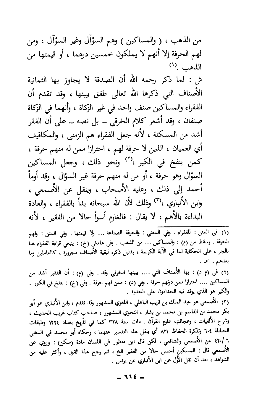 ش: لما ذكر - رَحِمَهُ اللَّهُ - أن الصدقة لا يجاوز بها الثمانية الأصناف التي ذكرها الله تعالى طفق يبينها، وقد تقدم أن الفقراء والمساكين صنف واحد في غير الزكاة، وأنهما في الزكاة صنفان، وقد أشعر كلام الخرقي - بل نصه - على أن الفقر أشد من المسكنة، لأنه جعل الفقراء هم الزمنى، والمكافيف أي العميان، الذين لا حرفة لهم، احترازا ممن له منهم حرفة، كمن ينفخ في الكير، ونحو ذلك، وجعل المساكين السؤال وهو حرفة، أو من له منهم حرفة غير السؤال، وقد أومأ أحمد إلى ذلك، وعليه الأصحاب، وينقل عن الأصمعي، وابن الأنباري، وذلك لأن الله سبحانه بدأ بالفقراء، والعادة البداءة بالأهم، لا يقال: فالغارم أسوأ حالا من الفقير، لأنه