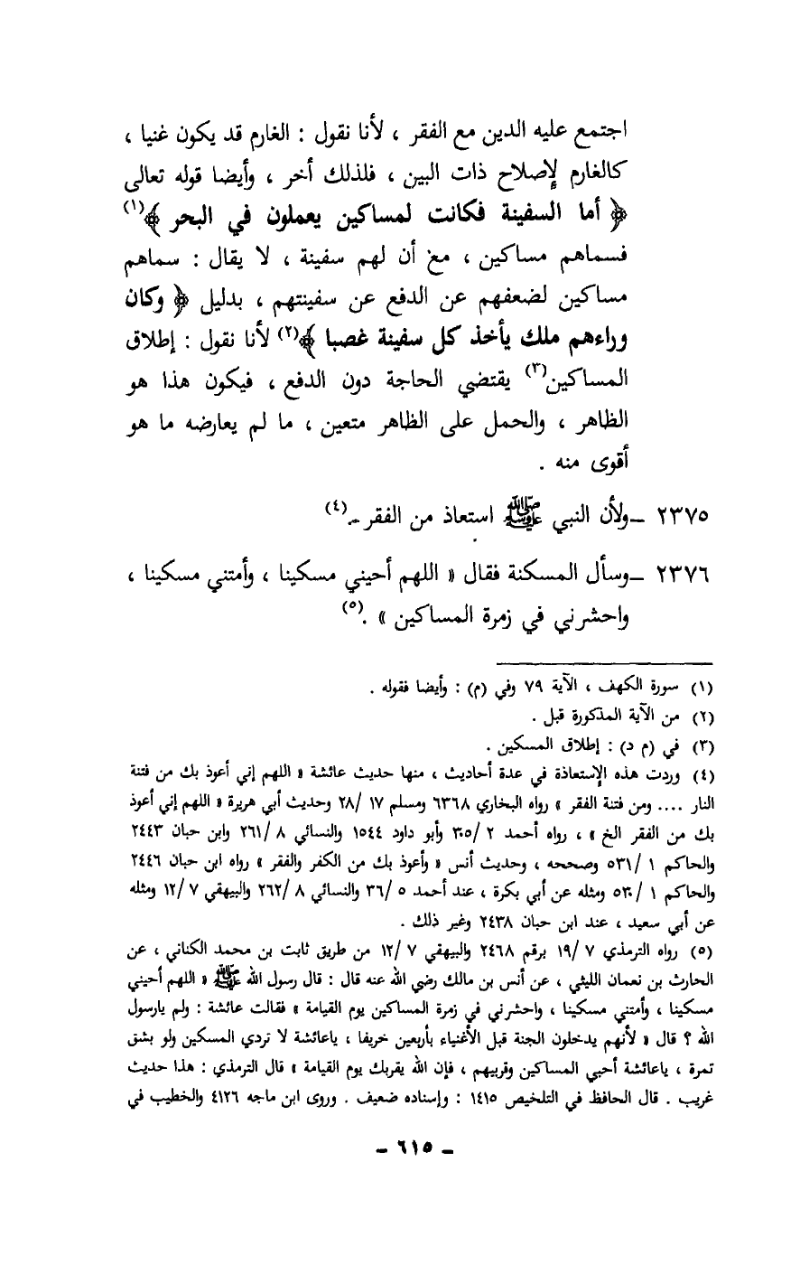 اجتمع عليه الدين مع الفقر، لأنا نقول: الغارم قد يكون غنيا، كالغارم لإصلاح ذات البين، فلذلك أخر، وأيضا قَوْله تَعَالَى: {أَمَّا السَّفِينَةُ فَكَانَتْ لِمَسَاكِينَ يَعْمَلُونَ فِي الْبَحْرِ} [الكهف: 79] فسماهم مساكين، مع أن لهم سفينة، لا يقال: سماهم مساكين لضعفهم عن الدفع عن سفينتهم، بدليل {وَكَانَ وَرَاءَهُمْ مَلِكٌ يَأْخُذُ كُلَّ سَفِينَةٍ غَصْبًا} [الكهف: 79] لأنا نقول: إطلاق المساكين يقتضي الحاجة دون الدفع، فيكون هذا هو الظاهر، والحمل على الظاهر متعين، ما لم يعارضه ما هو أقوى منه.
