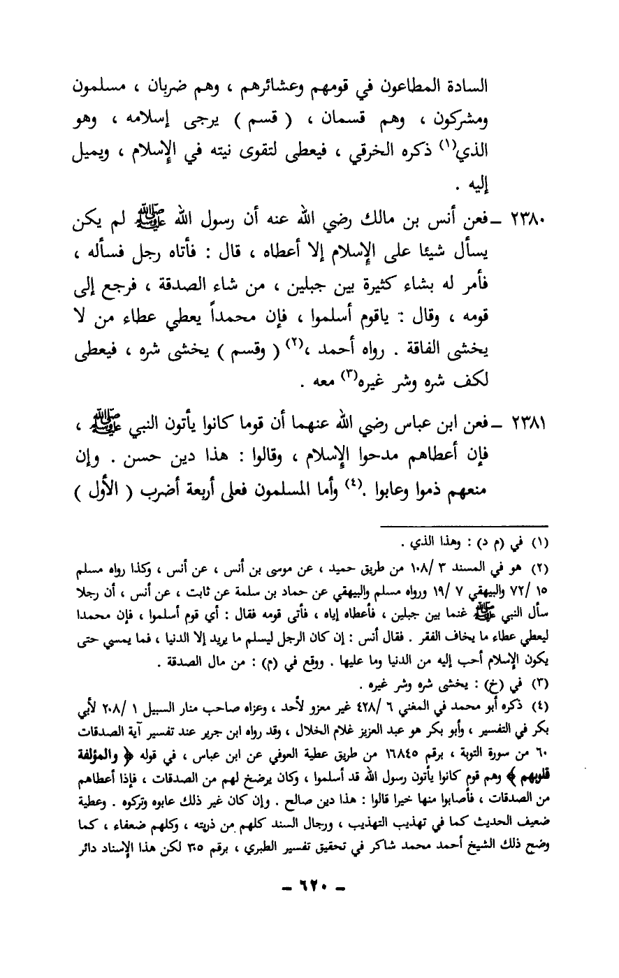 2380 - فعن أنس بن مالك - رَضِيَ اللَّهُ عَنْهُ - «أن رسول الله - صَلَّى اللَّهُ عَلَيْهِ وَسَلَّمَ - لم يكن يسأل شيئا على الإسلام إلا أعطاه، قال: فأتاه رجل فسأله، فأمر له بشاء كثيرة بين جبلين، من شاء الصدقة، فرجع إلى قومه، وقال: يا قوم أسلموا، فإن محمدا يعطي عطاء من لا يخشى الفاقة» . رواه أحمد. (وقسم) يخشى شره، فيعطى لكف شره وشر غيره معه.
