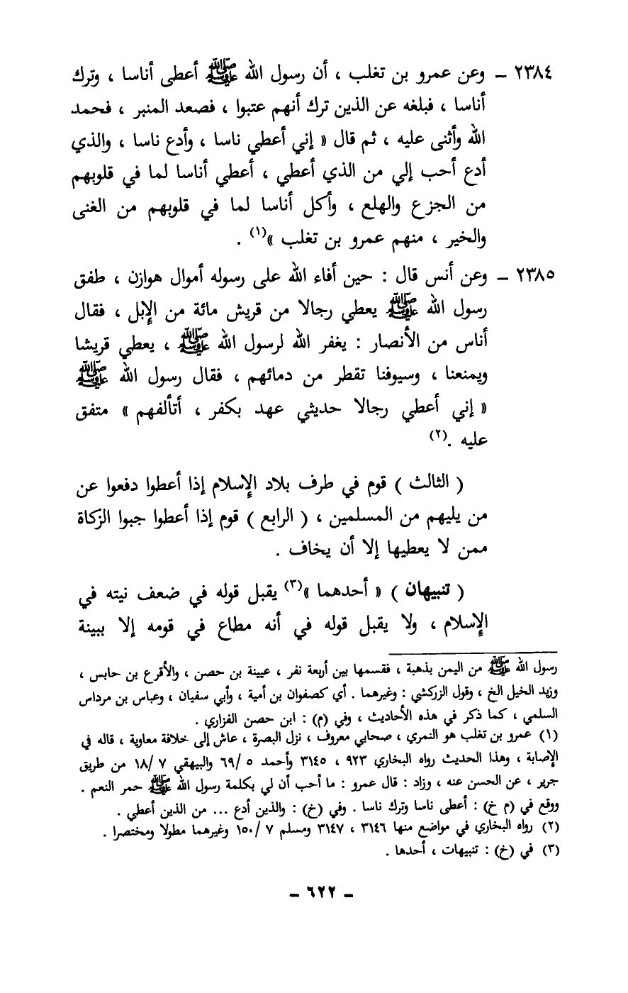 2384 - وعن عمرو بن تغلب، «أن رسول الله - صَلَّى اللَّهُ عَلَيْهِ وَسَلَّمَ - أعطى أناسا، وترك أناسا، فبلغه عن الذين ترك أنهم عتبوا، فصعد المنبر، فحمد الله وأثنى عليه، ثم قال: «إني أعطي ناسا، وأدع ناسا، والذي أدع أحب إلي من الذي أعطي، أعطي أناسا لما في قلوبهم من الجزع والهلع، وأكل أناسا لما في قلوبهم من الغنى والخير، منهم عمرو بن تغلب» .