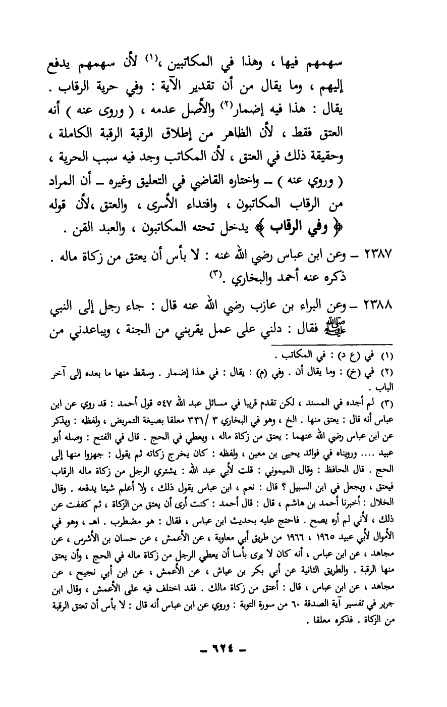 2387 - وعن ابن عباس - رَضِيَ اللَّهُ عَنْهُ -: لا بأس أن يعتق من زكاة ماله، ذكره عنه أحمد والبخاري.