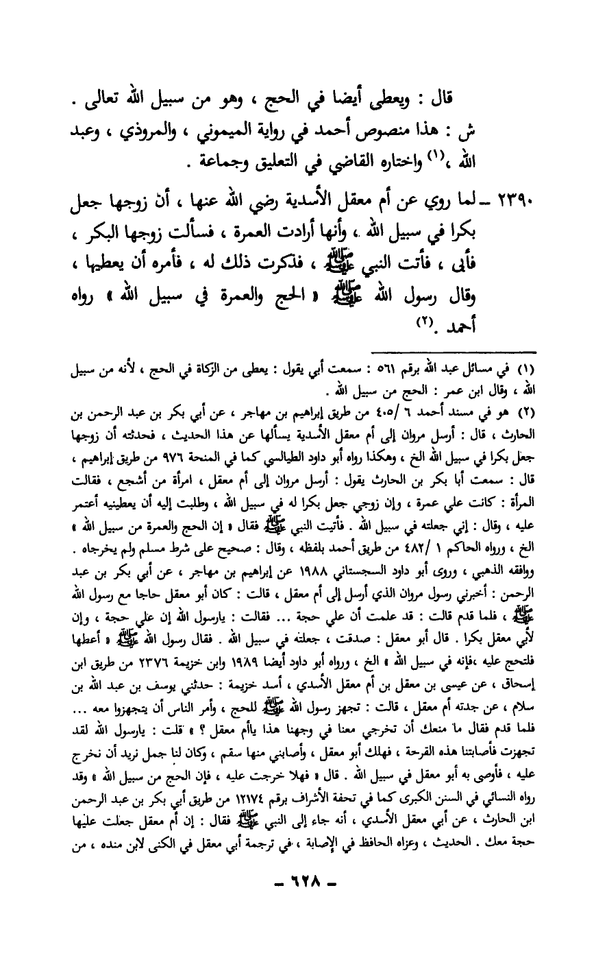 2390 - لما روي «عن أم معقل الأسدية - رَضِيَ اللَّهُ عَنْهَا -، أن زوجها جعل بكرا في سبيل الله، وأنها أرادت العمرة، فسألت زوجها البكر، فأبى، فأتت النبي - صَلَّى اللَّهُ عَلَيْهِ وَسَلَّمَ - فذكرت ذلك له، فأمره أن يعطيها، وقال رسول الله - صَلَّى اللَّهُ عَلَيْهِ وَسَلَّمَ -: «الحج والعمرة في سبيل الله» رواه أحمد.