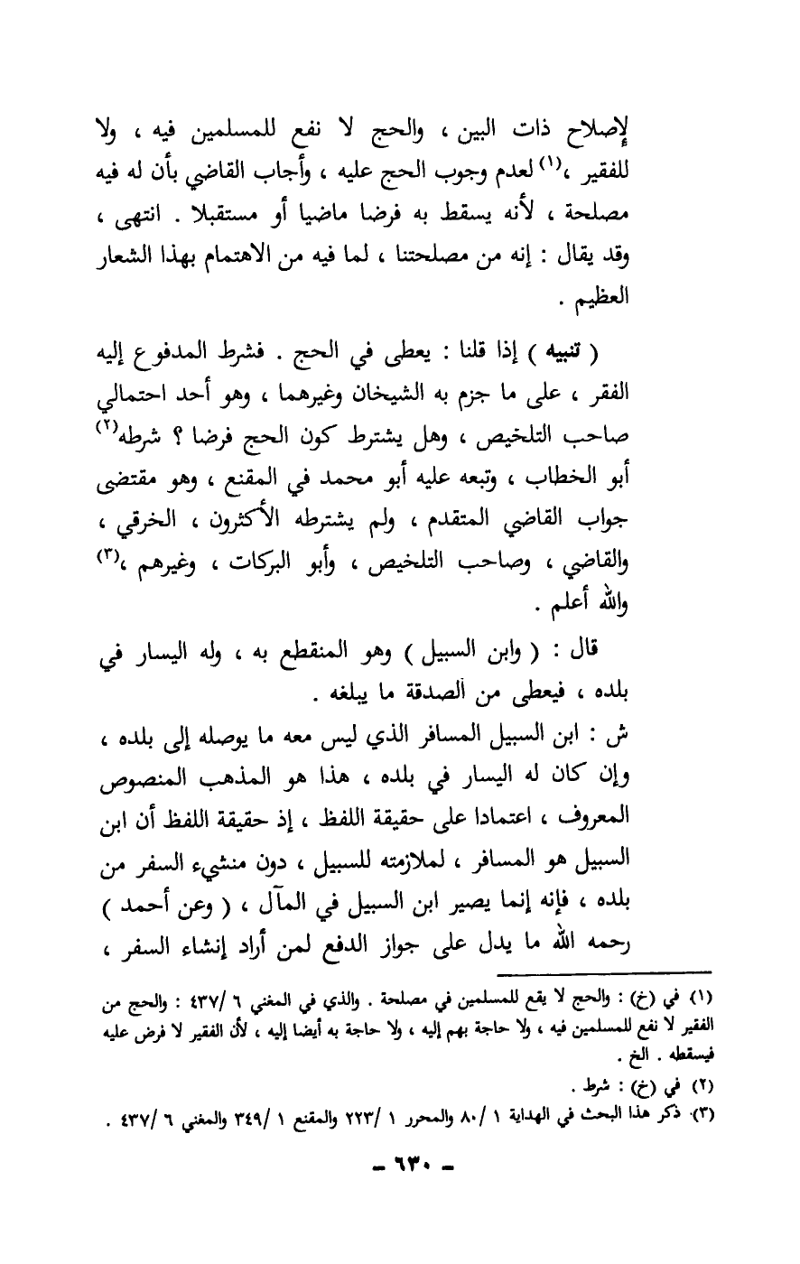 لإصلاح ذات البين، والحج لا نفع للمسلمين فيه، ولا للفقير، لعدم وجوب الحج عليه، وأجاب القاضي بأن له فيه مصلحة، لأنه يسقط به فرضا ماضيا أو مستقبلا. انتهى.