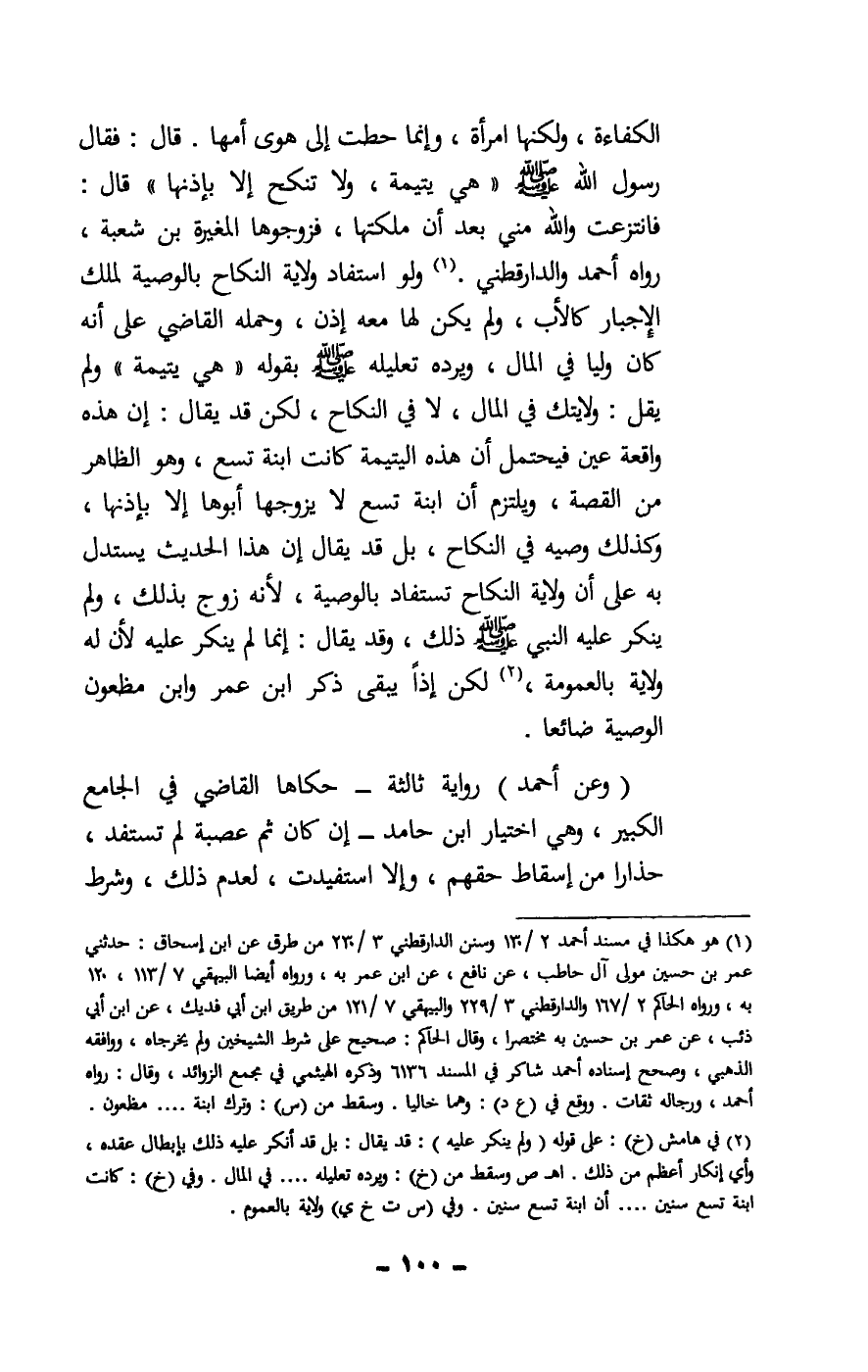 الكفاءة، ولكنها امرأة، وإنما حطت إلى هوى أمها. قال: فقال رسول الله - صَلَّى اللَّهُ عَلَيْهِ وَسَلَّمَ -: «هي يتيمة، ولا تنكح إلا بإذنها» قال: فانتزعت والله مني بعد أن ملكتها، فزوجوها المغيرة بن شعبة» ، رواه أحمد، والدارقطني. ولو استفاد ولاية النكاح بالوصية لملك الإجبار كالأب، ولم يكن لها معه إذن، وحمله القاضي على أنه كان وليا في المال، ويرده تعليله بقوله: - صَلَّى اللَّهُ عَلَيْهِ وَسَلَّمَ - هي يتيمة ولم يقل: ولايتك في المال، لا في النكاح، لكن قد يقال: إن هذه واقعة عين فيحتمل أن هذه اليتيمة كانت ابنة تسع، وهو الظاهر من القصة، ويلتزم أن ابنة تسع لا يزوجها أبوها إلا بإذنها، وكذلك وصيه في النكاح، بل قد يقال إن هذا الحديث يستدل به على أن ولاية النكاح تستفاد بالوصية، لأنه زوج بذلك، ولم ينكر عليه النبي - صَلَّى اللَّهُ عَلَيْهِ وَسَلَّمَ - ذلك، وقد يقال: إنما لم ينكر عليه لأن له ولاية بالعمومة، لكن إذاً يبقى ذكر ابن عمر وابن مظعون الوصية ضائعا.