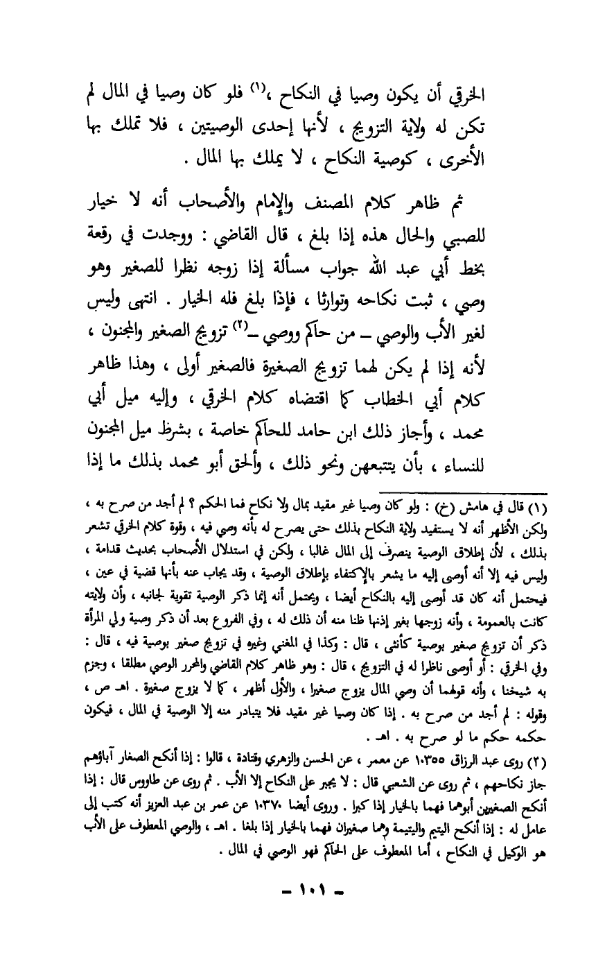 الخرقي أن يكون وصيا في النكاح، فلو كان وصيا في المال لم تكن له ولاية التزويج، لأنها إحدى الوصيتين، فلا تملك بها الأخرى، كوصية النكاح، لا يملك بها المال.
