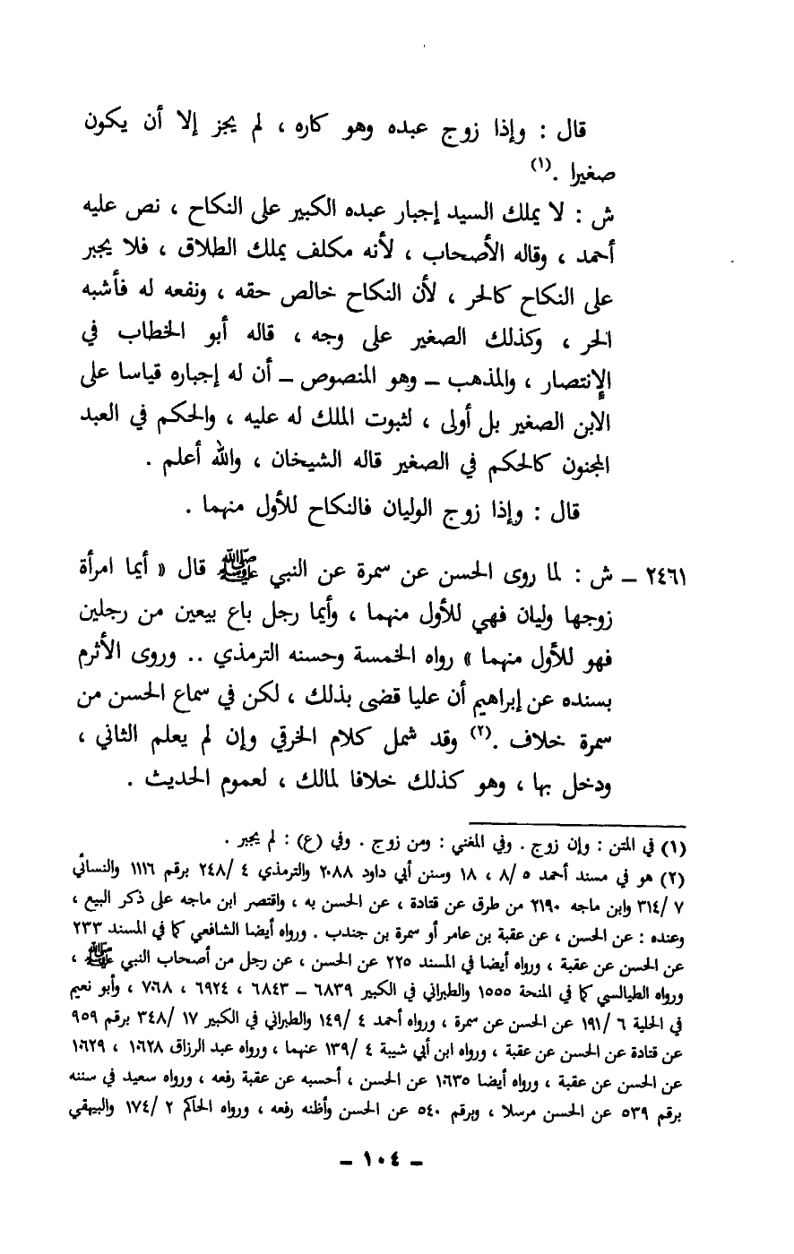ش: لا يملك السيد إجبار عبده الكبير على النكاح، نص عليه أحمد، وقاله الأصحاب، لأنه مكلف يملك الطلاق، فلا يجبر على النكاح كالحر، لأن النكاح خالص حقه، ونفعه له فأشبه الحر، وكذلك الصغير على وجه، قاله أبو الخطاب في الانتصار، والمذهب - وهو المنصوص - أن له إجباره قياسا على الابن الصغير بل أولى، لثبوت الملك له عليه، والحكم في العبد المجنون كالحكم في الصغير، قاله الشيخان، والله أعلم.