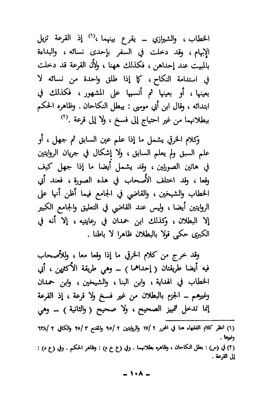 وقد خرج من كلام الخرقي ما إذا وقعا معا، وللأصحاب فيه أيضا طريقتان: (إحداهما) : - وهي طريقة الأكثرين، أبي الخطاب في الهداية، وابن البنا، والشيخين، وابن حمدان وغيرهم - الجزم بالبطلان من غير فسخ ولا قرعة، إذ القرعة إنما تدخل لتمييز الصحيح، ولا صحيح. (والثانية) : - وهي