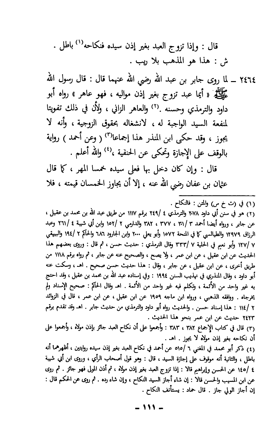 2464 - لما روى جابر بن عبد الله - رَضِيَ اللَّهُ عَنْهُمَا - قال: قال رسول الله - صَلَّى اللَّهُ عَلَيْهِ وَسَلَّمَ -: «أيما عبد تزوج بغير إذن مواليه، فهو عاهر» رواه أبو داود، والترمذي وحسنه. والعاهر الزاني، ولأن في ذلك تفويتا لمنفعة السيد الواجبة له، لانشغاله بحقوق الزوجية، وأنه لا يجوز، وقد حكى ابن المنذر هذا إجماعا، (وعن أحمد) رواية بالوقف على الإجازة وتحكى عن الحنفية، والله أعلم.