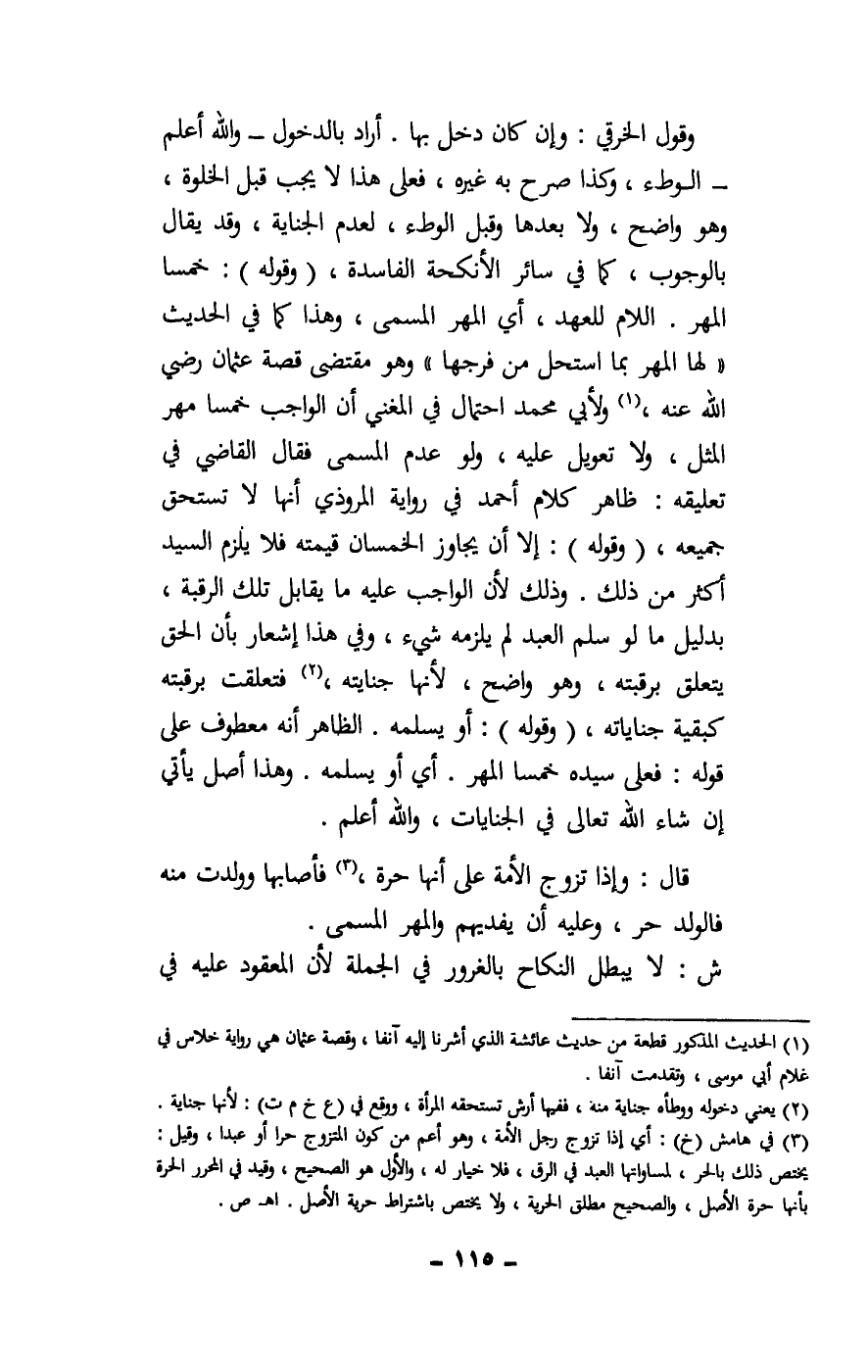 وقول الخرقي: وإن كان دخل بها. أراد بالدخول - والله أعلم - الوطء، وكذا صرح به غيره، فعلى هذا لا يجب قبل الخلوة، وهو واضح، ولا بعدها وقبل الوطء، لعدم الجنابة، وقد يقال بالوجوب، كما في سائر الأنكحة الفاسدة، (وقوله) : خمسا المهر. - اللام للعهد - أي المهر المسمى، وهذا كما في الحديث «لها المهر بما استحل من فرجها» وهو مقتضى قصة عثمان - رَضِيَ اللَّهُ عَنْهُ -، ولأبي محمد احتمال في المغني أن الواجب خمسا مهر المثل، ولا تعويل عليه، ولو عدم المسمى فقال القاضي في تعليقه: ظاهر كلام أحمد في رواية المروذي أنها لا تستحق جميعه، (وقوله) : إلا أن يجاوز الخمسان قيمته فلا يلزم السيد أكثر من ذلك.