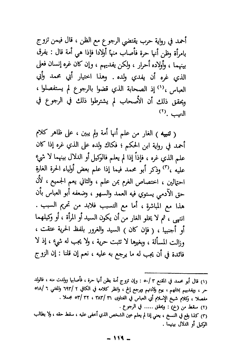 أحمد في رواية حرب يقتضي الرجوع مع الظن، قال فيمن تزوج بامرأة وظن أنها حرة فأصاب منها أولادا فإذا هي أمة، قال: يفرق بينهما، وأولاده أحرار، ولكن يفديهم، وإن كان غره إنسان فعلى الذي غره أن يفدي ولده. وهذا اختيار أبي محمد، وأبي العباس، إذ الصحابة الذين قضوا بالرجوع لم يستفصلوا، ويحقق ذلك أن الأصحاب لم يشترطوا ذلك في الرجوع في العيب.