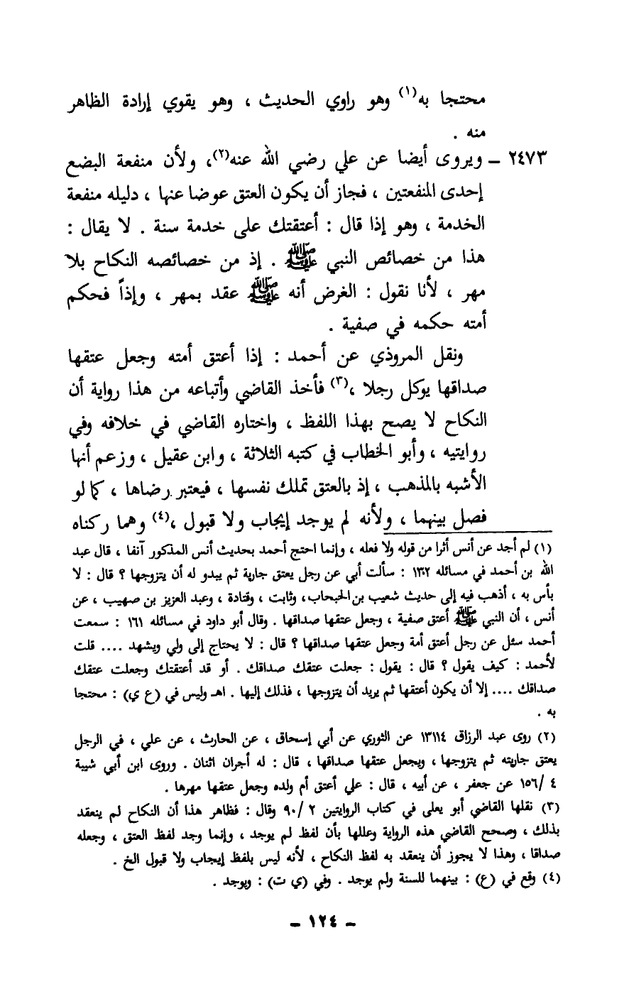 2473 - ويروى أيضا عن علي - رَضِيَ اللَّهُ عَنْهُ -، ولأن منفعة البضع إحدى المنفعتين، فجاز أن يكون العتق عوضا عنها، دليله منفعة الخدمة، وهو إذا قال: أعتقتك على خدمة سنة. لا يقال: هذا من خصائص النبي - صَلَّى اللَّهُ عَلَيْهِ وَسَلَّمَ -. إذ من خصائصه النكاح بلا مهر، لأنا نقول: الغرض أنه - صَلَّى اللَّهُ عَلَيْهِ وَسَلَّمَ - عقد بمهر، وإذًا فحكم أمته حكمه في صفية.