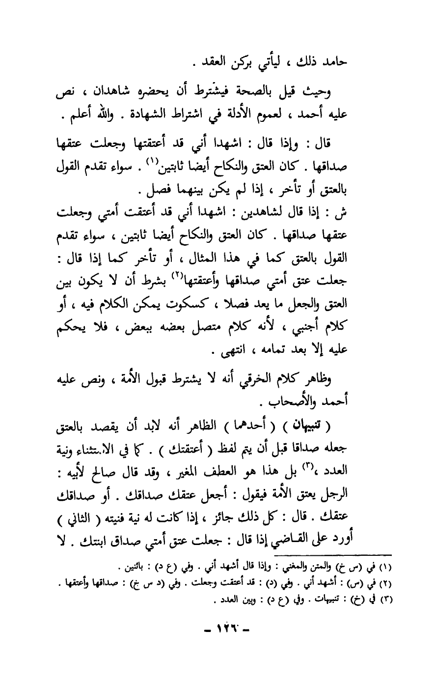 ش: إذا قال لشاهدين: اشهدا أني قد أعتقت أمتي وجعلت عتقها صداقها. كان العتق والنكاح أيضا ثابتين، سواء تقدم القول بالعتق كما في هذا المثال، أو تأخر كما إذا قال: جعلت عتق أمتي صداقها وأعتقتها بشرط أن لا يكون بين العتق والجعل ما يعد فصلا، كسكوت يمكن الكلام فيه، أو كلام أجنبي، لأنه كلام متصل بعضه ببعض، فلا يحكم عليه إلا بعد تمامه، انتهى.