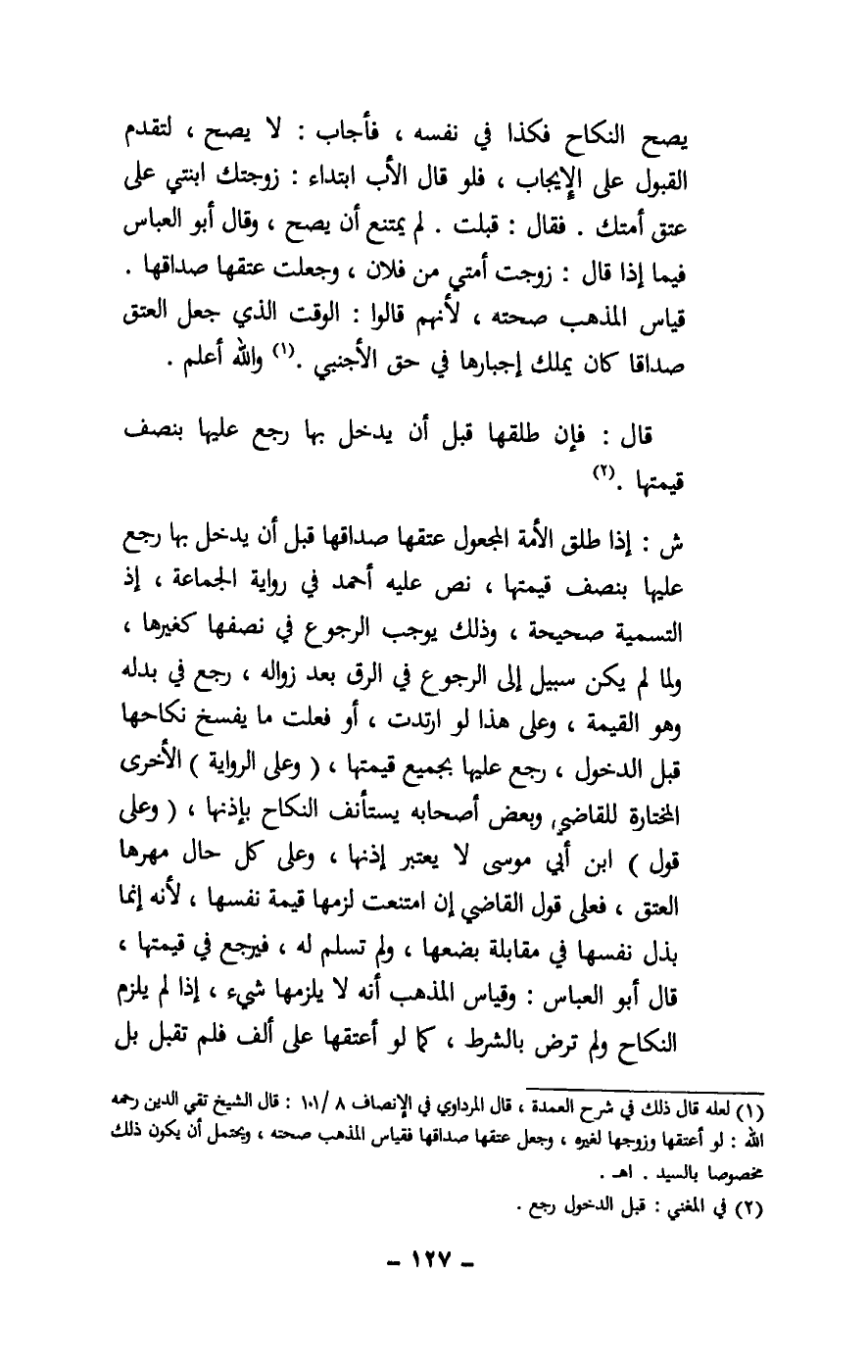 ش: إذا طلق الأمة المجعول عتقها صداقها قبل أن يدخل بها رجع عليها بنصف قيمتها، نص عليه أحمد في رواية الجماعة، إذ التسمية صحيحة، وذلك يوجب الرجوع في نصفها كغيرها، ولما لم يكن سبيل إلى الرجوع في الرق بعد زواله، رجع في بدله وهو القيمة، وعلى هذا لو ارتدت، أو فعلت ما يفسخ نكاحها قبل الدخول، رجع عليها بجميع قيمتها، (وعلى الرواية) الأخرى المختارة للقاضي وبعض أصحابه يستأنف النكاح بإذنها، (وعلى قول) ابن أبي موسى لا يعتبر إذنها، وعلى كل حال مهرها العتق، فعلى قول القاضي إن امتنعت لزمها قيمة نفسها، لأنه إنما بذل نفسها في مقابلة بضعها، ولم تسلم له، فيرجع في قيمتها، قال أبو العباس: وقياس المذهب أنه لا يلزمها شيء، إذا لم يلزم النكاح ولم ترض بالشرط، كما لو أعتقها على ألف فلم تقبل بل