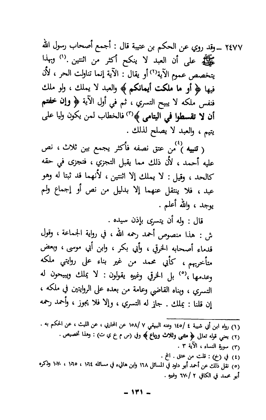 2477 - وقد روي عن الحكم بن عتيبة قال: أجمع أصحاب رسول الله - صَلَّى اللَّهُ عَلَيْهِ وَسَلَّمَ - على أن العبد لا ينكح أكثر من اثنتين. وبهذا يتخصص عموم الآية أو يقال الآية إنما تناولت الحر لأن فيها {أو ما ملكت أيمانكم} [النساء: 3] والعبد لا يملك، ولو ملك فنفس ملكه لا يبيح التسري، ثم في أول الآية {وإن خفتم أن لا تقسطوا في اليتامى} [النساء: 3] فالخطاب لمن يكون وليا على يتيم، والعبد لا يصلح لذلك.