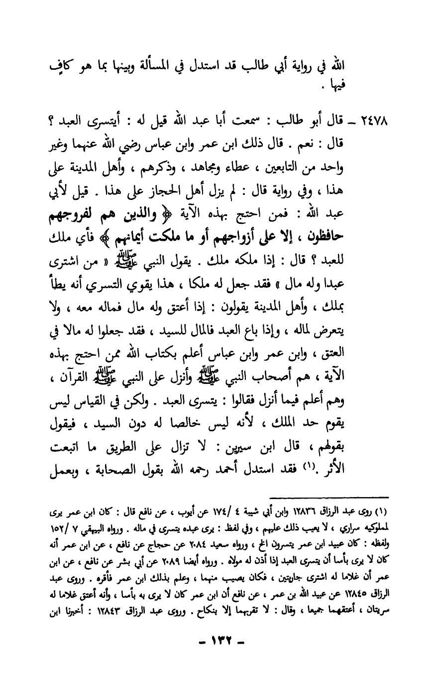 2478 - قال أبو طالب: سمعت أبا عبد الله قيل له: أيتسرى العبد؟ قال: نعم. قال ذلك ابن عمر وابن عباس - رَضِيَ اللَّهُ عَنْهُمَا - وغير واحد من التابعين، عطاء ومجاهد، وذكرهم، وأهل المدينة على هذا، وفي رواية قال: لم يزل أهل الحجاز على هذا. قيل لأبي عبد الله: فمن احتج بهذه الآية: {وَالَّذِينَ هُمْ لِفُرُوجِهِمْ حَافِظُونَ - إِلَّا عَلَى أَزْوَاجِهِمْ أوْ مَا مَلَكَتْ أَيْمَانُهُمْ} [المؤمنون: 5 - 6] فأي ملك للعبد؟ قال: إذا ملكه ملك. يقول النبي - صَلَّى اللَّهُ عَلَيْهِ وَسَلَّمَ -: من اشترى عبدا وله مال فقد جعل له ملكا، هذا يقوي التسري أنه يطأ بملك، وأهل المدينة يقولون: إذا أعتق وله مال فماله معه، ولا يتعرض لماله، وإذا باع العبد فالمال للسيد، فقد جعلوا له مالا في العتق، وابن عمر وابن عباس أعلم بكتاب الله ممن احتج بهذه الآية، هم أصحاب النبي - صَلَّى اللَّهُ عَلَيْهِ وَسَلَّمَ - وأنزل على النبي - صَلَّى اللَّهُ عَلَيْهِ وَسَلَّمَ - القرآن، وهم أعلم فيما أنزل فقالوا: يتسرى العبد. ولكن في القياس ليس يقوم حد الملك، لأنه ليس خالصا له دون السيد، فيقول بقولهم، قال ابن سيرين: لا تزال على الطريق ما اتبعت الأثر. فقد استدل أحمد - رَحِمَهُ اللَّهُ - بقول الصحابة، وبعمل