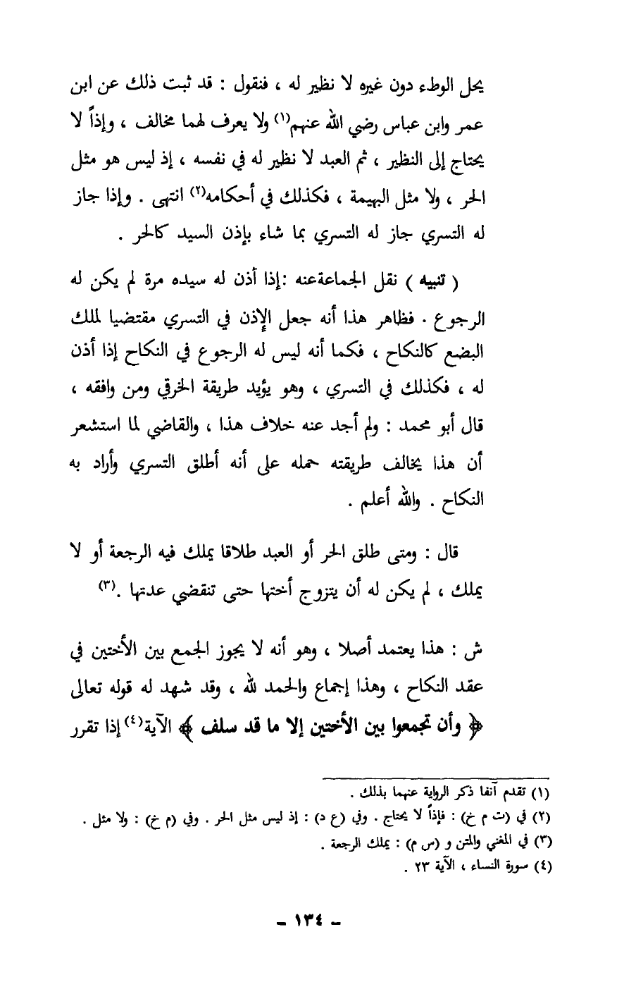 (تنبيه) نقل الجماعة عنه: إذا أذن له سيده مرة لم يكن له الرجوع. فظاهر هذا أنه جعل الإذن في التسري مقتضيا لملك البضع كالنكاح، فكما أنه ليس له الرجوع في النكاح إذا أذن له، فكذلك في التسري، وهو يؤيد طريقة الخرقي ومن وافقه، قال أبو محمد: ولم أجد عنه خلاف هذا، والقاضي لما استشعر أن هذا يخالف طريقته حمله على أنه أطلق التسري وأراد به النكاح. والله أعلم.