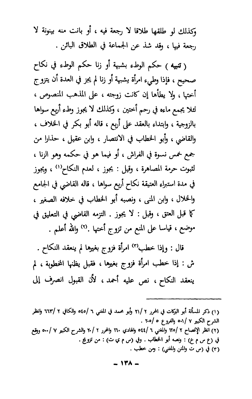 (تنبيه) حكم الوطء بشبهة أو زنا حكم الوطء في نكاح صحيح، فإذا وطئ امرأة بشبهة أو زنا لم يجز في العدة أو يتزوج أختها، ولا يطأها إن كانت زوجته، على المذهب المنصوص، لئلا يجمع ماءه في رحم أختين، وكذلك لا يجوز وطء أربع سواها بالزوجية، وابتداء بالعقد على أربع، قاله أبو بكر في الخلاف، والقاضي، وأبو الخطاب في الانتصار، وابن عقيل، حذارا من جمع خمس نسوة في الفراش، أو فيما هو في حكمه وهو الزنا، لثبوت حرمة المصاهرة، وقيل: يجوز، لعدم النكاح، ويجوز في مدة استبراء العتيقة نكاح أربع سواها، قاله القاضي في الجامع والخلال، وابن المنى، ونصبه أبو الخطاب في خلافه الصغير، كما قبل العتق، وقيل: لا يجوز. التزمه القاضي في التعليق في موضع، قياسا على المنع من تزوج أختها. والله أعلم.