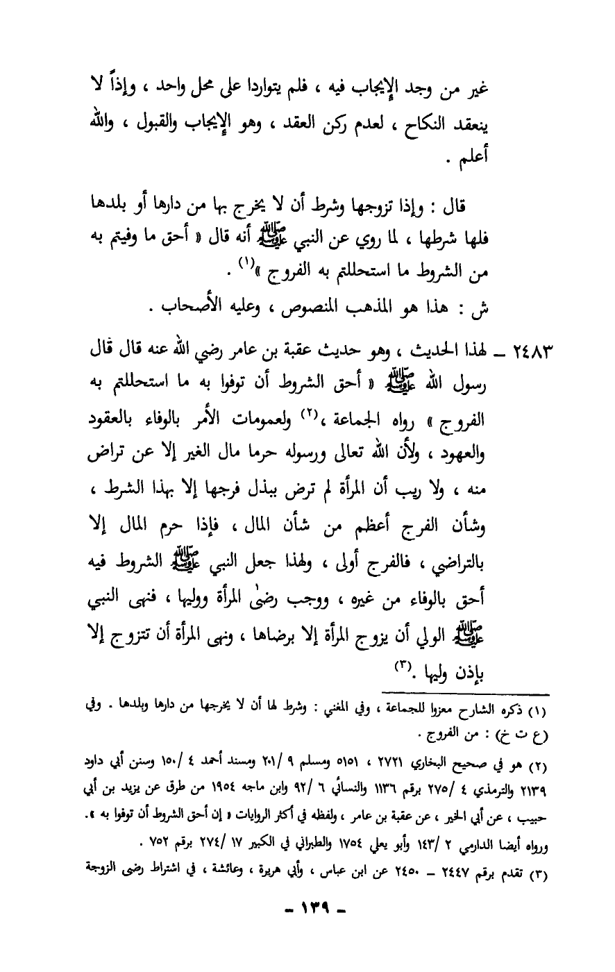 2483 - لهذا الحديث، وهو حديث عقبة بن عامر - رَضِيَ اللَّهُ عَنْهُ - قال قال رسول الله - صَلَّى اللَّهُ عَلَيْهِ وَسَلَّمَ -: «أحق الشروط أن توفوا به ما استحللتم به الفروج» رواه الجماعة، ولعمومات الأمر بالوفاء بالعقود والعهود، ولأن الله تعالى ورسوله حرما مال الغير إلا عن تراض منه، ولا ريب أن المرأة لم ترض ببذل فرجها إلا بهذا الشرط، وشأن الفرج أعظم من شأن المال، فإذا حرم المال إلا بالتراضي، فالفرج أولى، ولهذا جعل النبي - صَلَّى اللَّهُ عَلَيْهِ وَسَلَّمَ - الشروط فيه أحق بالوفاء من غيره، ووجب رضا المرأة ووليها، فنهى النبي - صَلَّى اللَّهُ عَلَيْهِ وَسَلَّمَ - الولي أن يزوج المرأة إلا برضاها، ونهى المرأة أن تتزوج إلا بإذن وليها.
