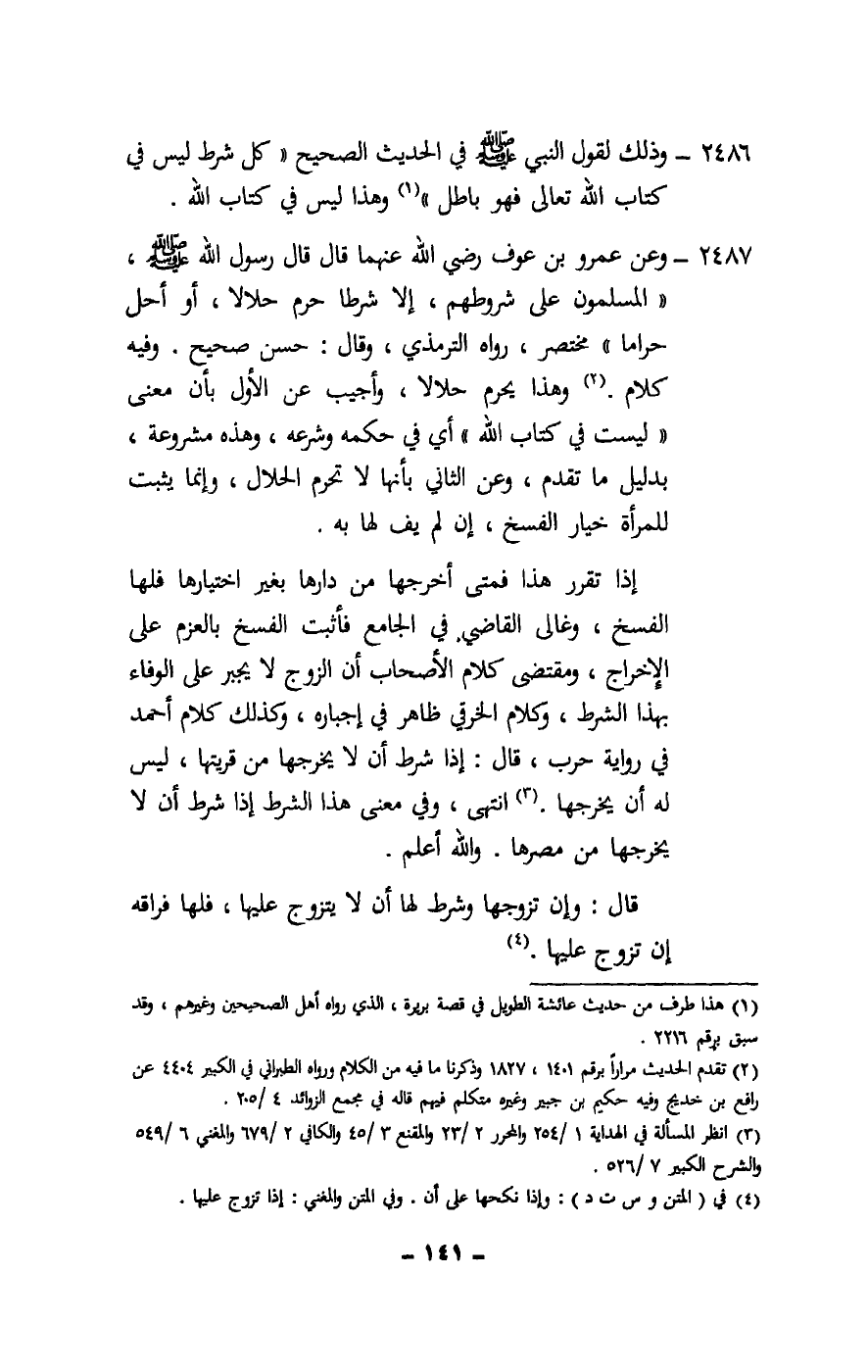 2487 - وعن عمرو بن عوف - رَضِيَ اللَّهُ عَنْهُمَا - قال قال رسول الله - صَلَّى اللَّهُ عَلَيْهِ وَسَلَّمَ -: «المسلمون على شروطهم، إلا شرطا حرم حلالا، أو أحل حراما» مختصر، رواه الترمذي، وقال: حسن صحيح. وفيه كلام. وهذا يحرم حلالا، وأجيب عن الأول بأن معنى ليست في كتاب الله أي في حكمه وشرعه، وهذه مشروعة، بدليل ما تقدم، وعن الثاني بأنها لا تحرم الحلال، وإنما يثبت للمرأة خيار الفسخ، إن لم يف لها به.