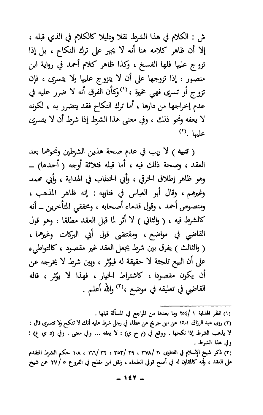ش: الكلام في هذا الشرط نقلا ودليلا كالكلام في الذي قبله، إلا أن ظاهر كلامه هنا أنه لا يجبر على ترك النكاح، بل إذا تزوج عليها فلها الفسخ، وكذا ظاهر كلام أحمد في رواية ابن منصور، إذا تزوجها على أن لا يتزوج عليها ولا يتسرى، فإن تزوج أو تسرى فهي مخيرة، وكأن الفرق أنه لا ضرر عليه في عدم إخراجها من دارها، أما ترك النكاح فقد يتضرر به، لكونه لا يعفه ونحو ذلك، وفي معنى هذا الشرط إذا شرط أن لا يتسرى عليها.