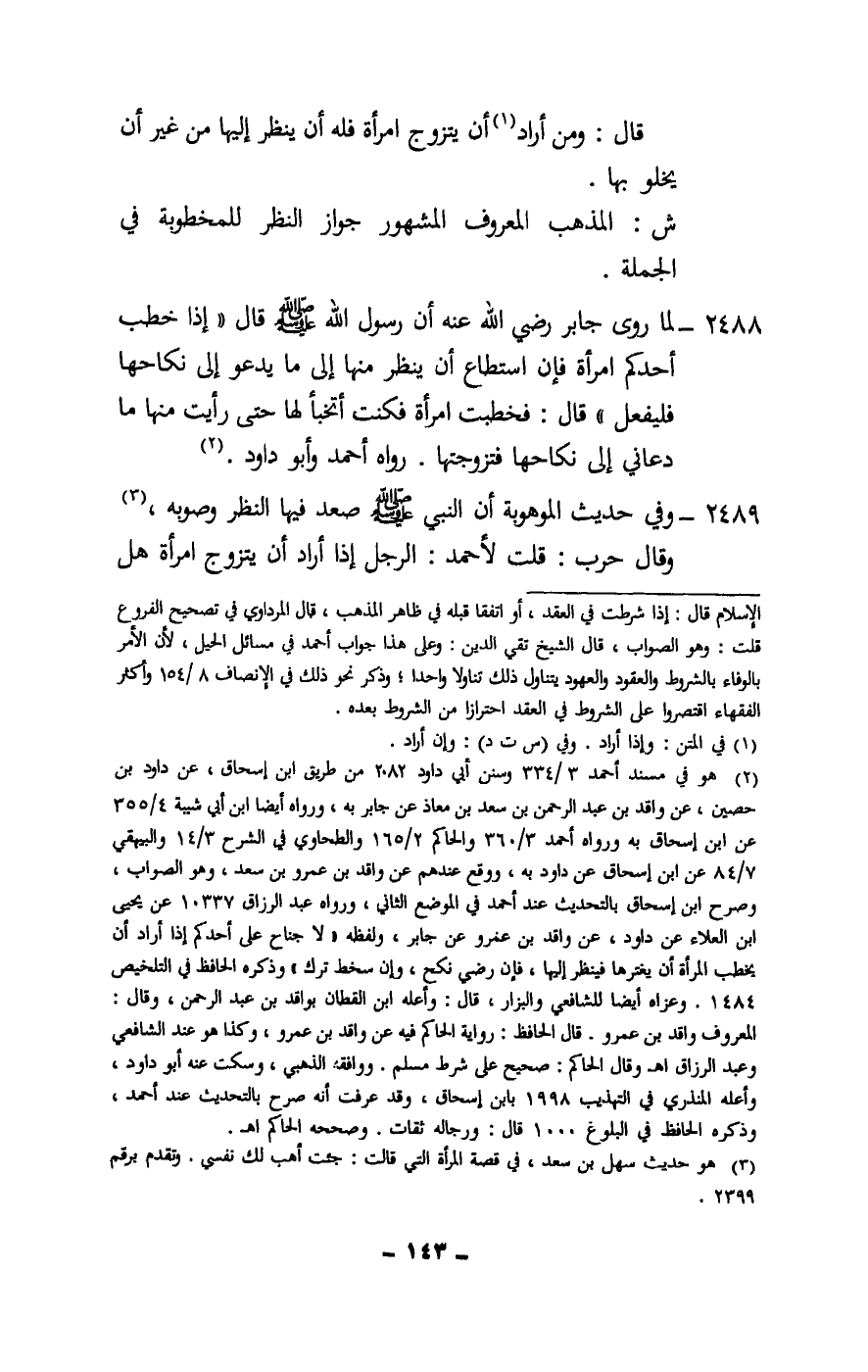 2489 - وفي «حديث الموهوبة أن النبي - صَلَّى اللَّهُ عَلَيْهِ وَسَلَّمَ - صعد فيها النظر وصوبه» ، وقال حرب: قلت لأحمد: الرجل إذا أراد أن يتزوج امرأة هل