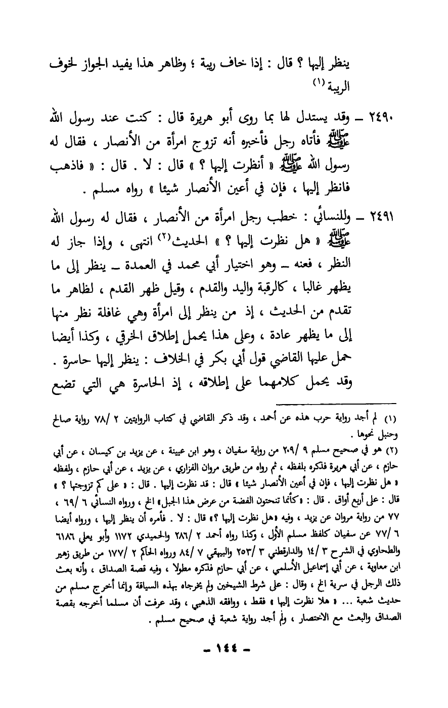 2490 - وقد يستدل لها بما روى أبو هريرة قال: «كنت عند رسول الله - صَلَّى اللَّهُ عَلَيْهِ وَسَلَّمَ - فأتاه رجل فأخبره أنه تزوج امرأة من الأنصار، فقال له رسول الله - صَلَّى اللَّهُ عَلَيْهِ وَسَلَّمَ -: «أنظرت إليها؟» قال: لا. قال: فاذهب فانظر إليها، فإن في أعين الأنصار شيئا» رواه مسلم.