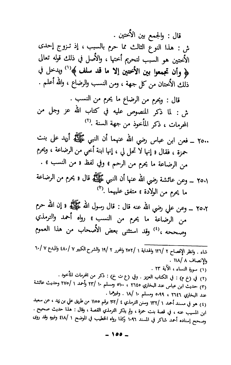 2502 - وعن علي - رَضِيَ اللَّهُ عَنْهُ - قال: قال رسول الله - صَلَّى اللَّهُ عَلَيْهِ وَسَلَّمَ -: «إن الله حرم من الرضاعة ما يحرم من النسب» رواه أحمد والترمذي وصححه، وقد استثنى بعض الأصحاب من هذا العموم