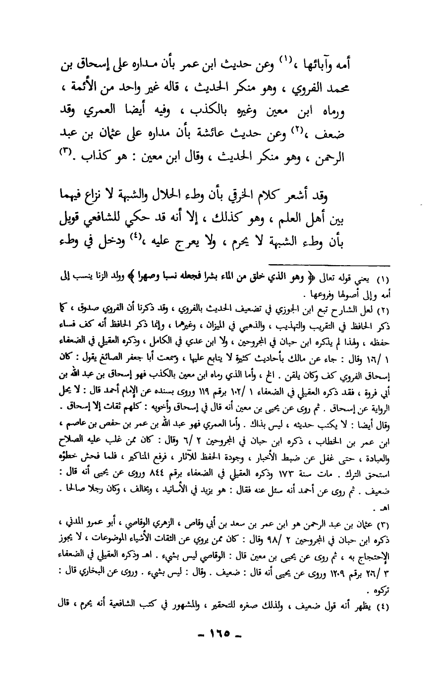 أمه وآبائها، وعن حديث ابن عمر بأن مداره على إسحاق بن محمد الفروي، وهو منكر الحديث، قاله غير واحد من الأئمة، ورماه ابن معين وغيره بالكذب، وفيه أيضا العمري وقد ضعف، وعن حديث عائشة بأن مداره على عثمان بن عبد الرحمن، وهو منكر الحديث، وقال ابن معين: هو كذاب.