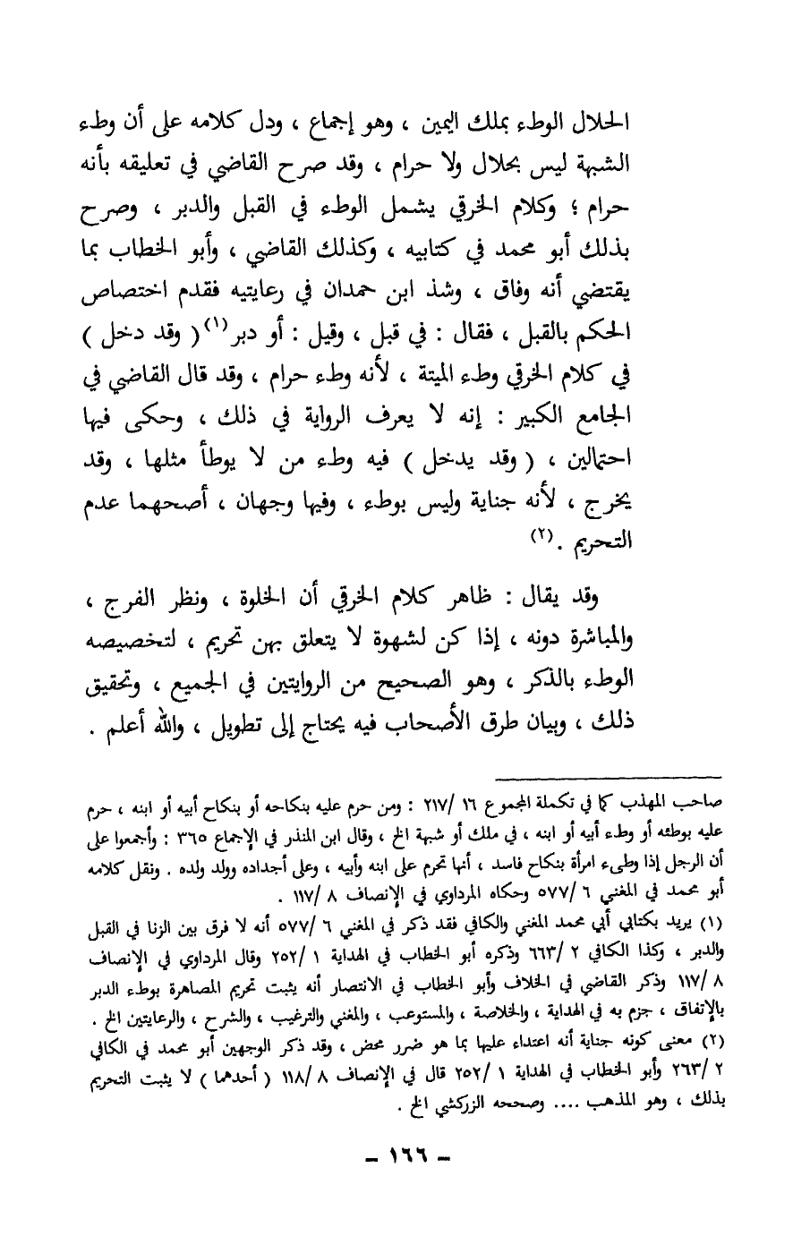 الحلال الوطء بملك اليمين، وهو إجماع، ودل كلامه على أن وطء الشبهة ليس بحلال ولا حرام، وقد صرح القاضي في تعليقه بأنه حرام؛ وكلام الخرقي يشمل الوطء في القبل والدبر، وصرح بذلك أبو محمد في كتابيه، وكذلك القاضي، وأبو الخطاب بما يقتضي أنه وفاق، وشذ ابن حمدان في رعايتيه فقدم اختصاص الحكم بالقبل، فقال: في قبل، وقيل: أو دبر (وقد دخل) في كلام الخرقي وطء الميتة، لأنه وطء حرام، وقد قال القاضي في الجامع الكبير: إنه لا يعرف الرواية في ذلك، وحكى فيها احتمالين، (وقد يدخل) فيه وطء من لا يوطأ مثلها، وقد يخرج، لأنه جناية وليس بوطء، وفيها وجهان، أصحهما عدم التحريم.