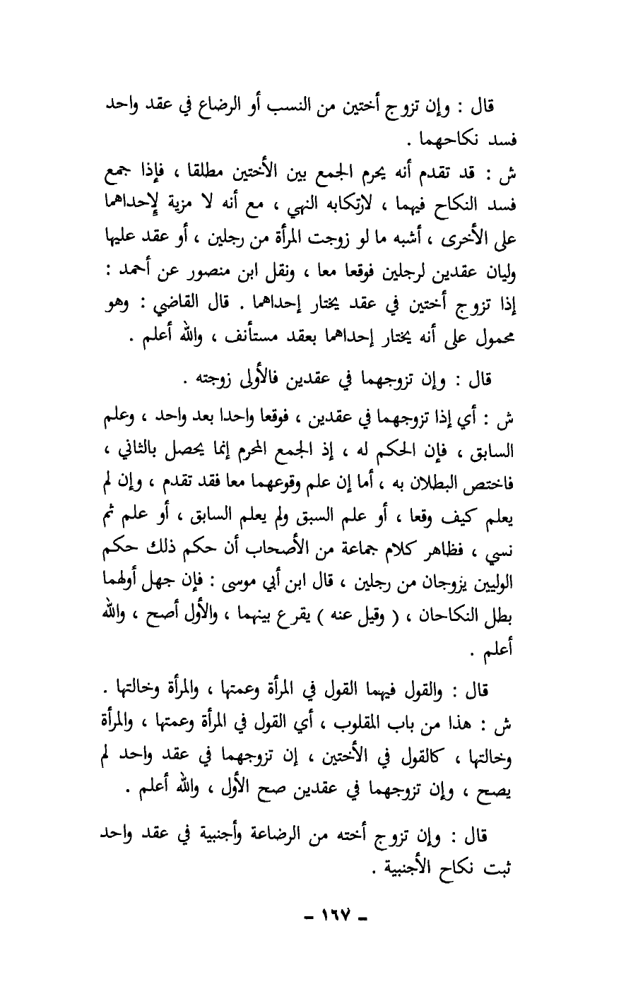 ش: قد تقدم أنه يحرم الجمع بين الأختين مطلقا، فإذا جمع فسد النكاح فيهما، لارتكابه النهي، مع أنه لا مزية لإحداهما على الأخرى، أشبه ما لو زوجت المرأة من رجلين، أو عقد عليها وليان عقدين لرجلين فوقعا معا، ونقل ابن منصور عن أحمد: إذا تزوج أختين في عقد يختار إحداهما. قال القاضي: وهو محمول على أنه يختار إحداهما بعقد مستأنف، والله أعلم.